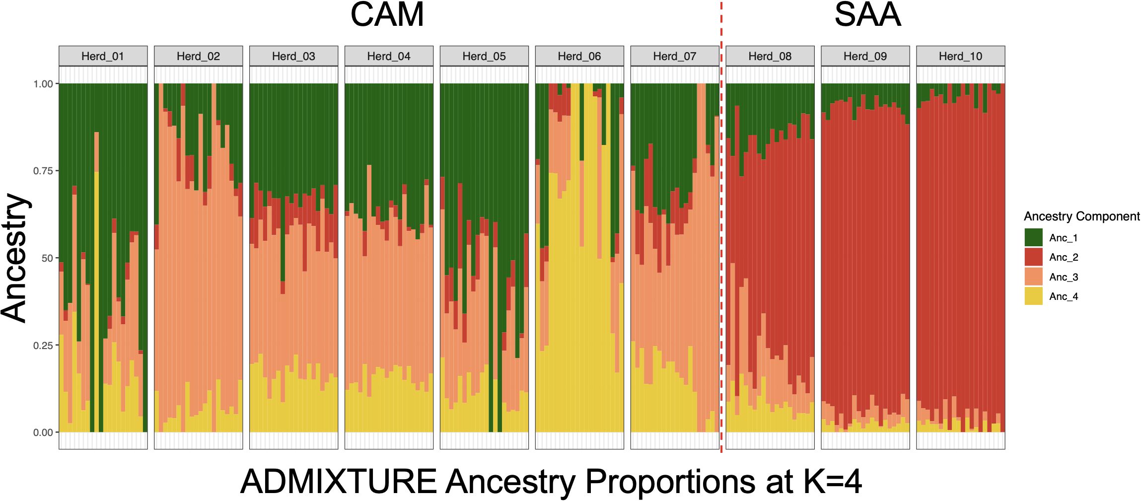 To further investigate population structure and potential admixture, the ADMIXTURE analysis was performed using K values from 2 to 7. The optimal number of clusters was determined to be K = 4, based on the lowest average cross-validation (CV) error assessed with ADMIXTURE as graphically represented in Supplementary Figure S2. Results revealed distinct ancestry patterns between the CAM and SAA breeds, as well as heterogeneity among herds within each breed (Figure 2). In the CAM herds (Herd_01 to Herd_07), ancestry proportions varied considerably across herds: Herd_01 showed a prevalent contribution of Ancestor 1 (61%), suggesting a more homogeneous genetic background in line with a specific breeding line. In contrast, Herd_02 and Herd_06 were primarily composed of Ancestor 3 (72%) and Ancestor 4 (67%), respectively. In the SAA herds the genetic background is predominantly shaped by Ancestor 2, which accounts for the majority of the estimated genome-wide ancestry in these populations. Herd_10 shows the highest contribution, with 92%, followed by Herd_09 (87%) and Herd_08 (62%).