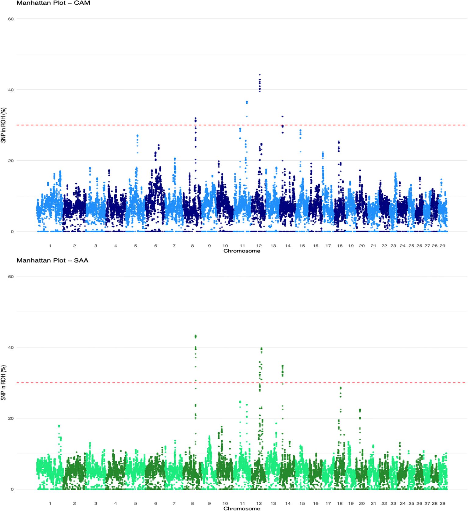 Figure 5. Manhattan plots showing the proportion of SNPs within ROH across all autosomes for CAM (top) and SAA (bottom) goats (all Herds were analysed together by breed).