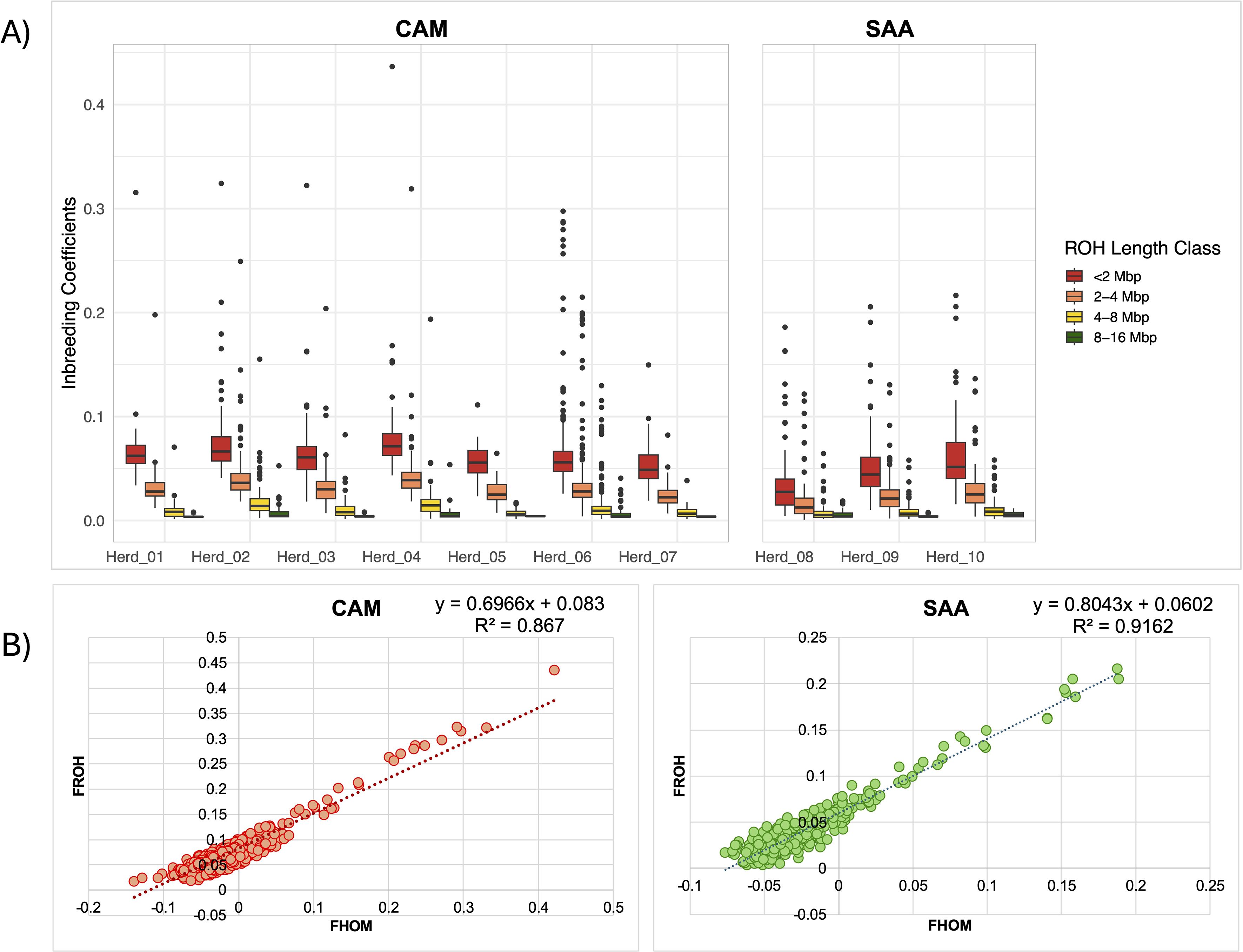 At the breed level, R² values indicate a strong overall correlation between FROH and FHOM (0.86 for CAM and 0.91 for SAA; Figure 6B). When examined by herd, Pearson r ranged from 0.93 to 0.99 (R² = 0.87–0.98), while Spearman p ranged from 0.88 to 0.97, with all p-values highly significant. These results confirm that both metrics consistently reflect individual genomic inbreeding, with detailed values provided in Supplementary Table S4.