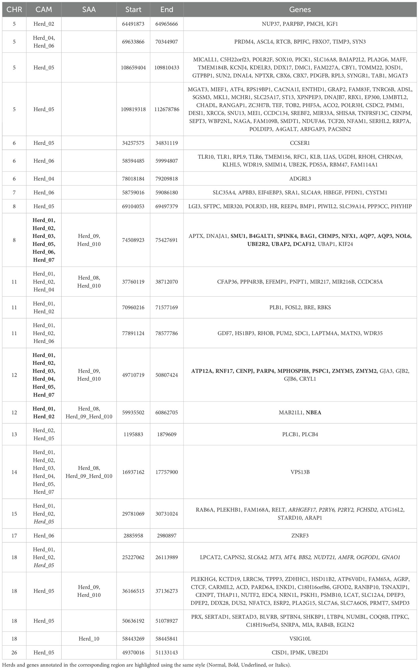 The distribution of ROH observed in Alpine goats in this study aligns with findings in other goat breeds, such as Egyptian and various Italian breeds, where a predominance of short ROH segments has been reported, suggesting historical selection and inbreeding events. Recent studies on Alpine and Mediterranean goat breeds have further highlighted breed-specific ROH patterns, reflecting the influence of breeding practices and environmental adaptations (Manunza et al., 2023; Pegolo et al., 2025). Similar patterns of ROH length distributions, reflecting both ancient and recent inbreeding, have also been reported in other livestock species such as cattle and sheep, highlighting the general influence of herd management, mating strategies, and demographic history on genomic homozygosity (Strillacci et al., 2020; Benedetti del Rio et al., 2025). The integration of ROH length distribution with the analysis of ROH islands adds further resolution to these patterns. While short ROHs point to ancient demographic events (Doekes et al., 2019), ROH islands reveal signatures of both shared and herd-specific selective pressures. Several genomic regions are common to both CAM and SAA, consistent with their shared ancestry and exposure to similar selection regimes, whereas others appear breed-specific, reflecting divergent breeding goals and management choices. Moreover, some ROH islands are consistently shared across multiple herds (Table 4), which may indicate the diffusion of particular haplotypes through the widespread use of popular sires or parallel selection schemes. Conversely, herd-specific ROH islands highlight unique management histories or localized selection pressures. Taken together, these findings demonstrate how both historical demographic processes and herd-level breeding dynamics have shaped the genomic landscape of Alpine dairy goats in Lombardy.