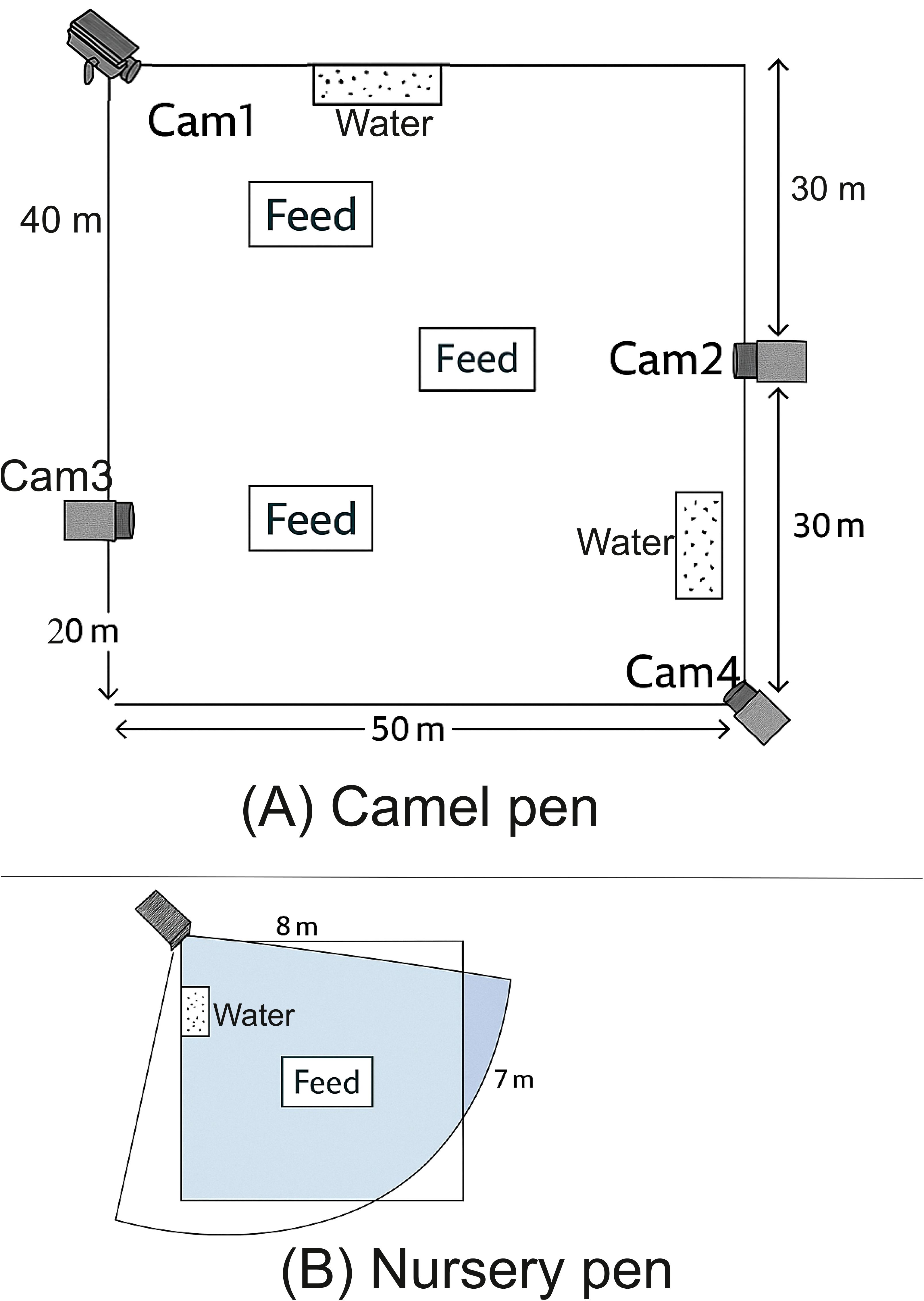 Figure 1. Schematic diagram of the camel pens and camera distribution. The larger pen (a), measuring 60 × 50 m, houses pregnant camels and is equipped with four surveillance cameras (Cam1–Cam4) for continuous monitoring of their daily activities. Multiple feeding utensils and water sources are distributed throughout the pen. The smaller pen (b), measuring 8 × 7 m, is designated for a postpartum camel and her newborn, monitored by a single camera illustrating its field of view and coverage area.
