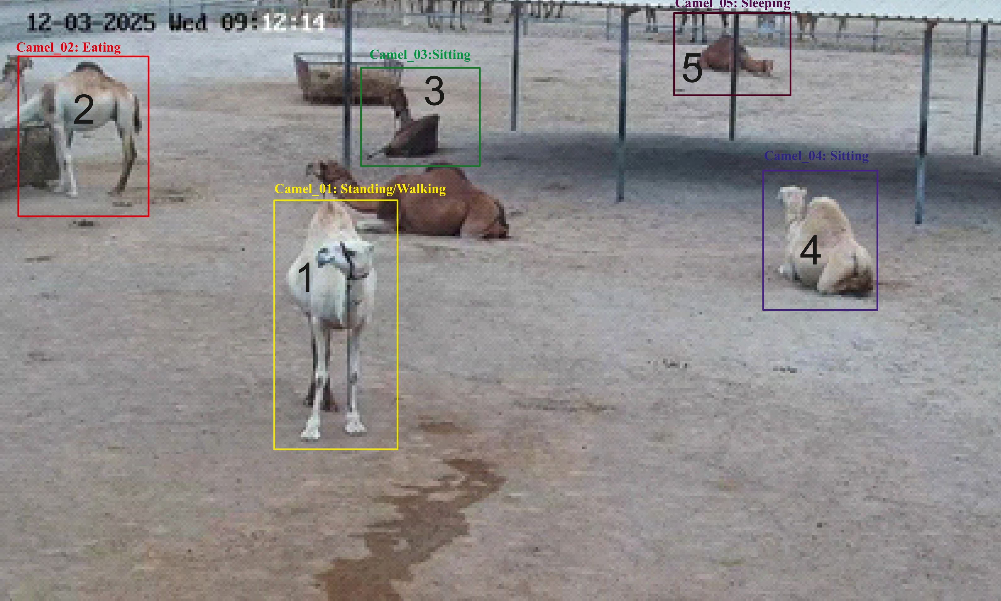 This experiment included continuous monitoring of daily activities of 12 visibly identifiable pregnant camels, each fitted with a distinct color-coded neck collar. Observations were conducted during late gestation (between 8 and 11 months of pregnancy) over 10 non-consecutive testing days, spaced by three-day intervals, during November and December 2024. In addition, the same females were closely monitored around parturition, with each daily activity data recorded one day before and one day after parturition between January and March 2025. The expected delivery period for each female was estimated based on mating records and clinical signs of impending parturition, such as pelvic ligament relaxation, vulvar swelling, and udder enlargement and distension (Tibary and Anouassi, 2001). Daily camel activities were classified according to Al-Khateeb et al. (2024) into: (i) Eating, The camel remains standing with its head positioned inside the feeding tank; (ii) Drinking, same as the eating activity but its head inside the water tank; (iii) Standing/Walking, when the animal remains in upright position and/or in motion. Standing and walking were grouped together (Standing/Walking) because short walking movements often mix with standing during crowding or partial visibility.; (iv) Sitting, with all legs folded and brisket on the ground; (v) Sleeping, in either a sitting posture with the head resting on the ground, or in a lateral recumbent position with the head similarly positioned on the ground. To ensure diverse visual representation and reduce frame redundancy, non-consecutive video frames were sampled for annotation. Annotations were performed using LabelImg version 1.4.0, with manual bounding boxes and activity labels validated for accuracy. The generated CAMIC-Behav dataset was partitioned into training (70%), validation (20%), and testing (10%) sets, excluding any ambiguous frames.