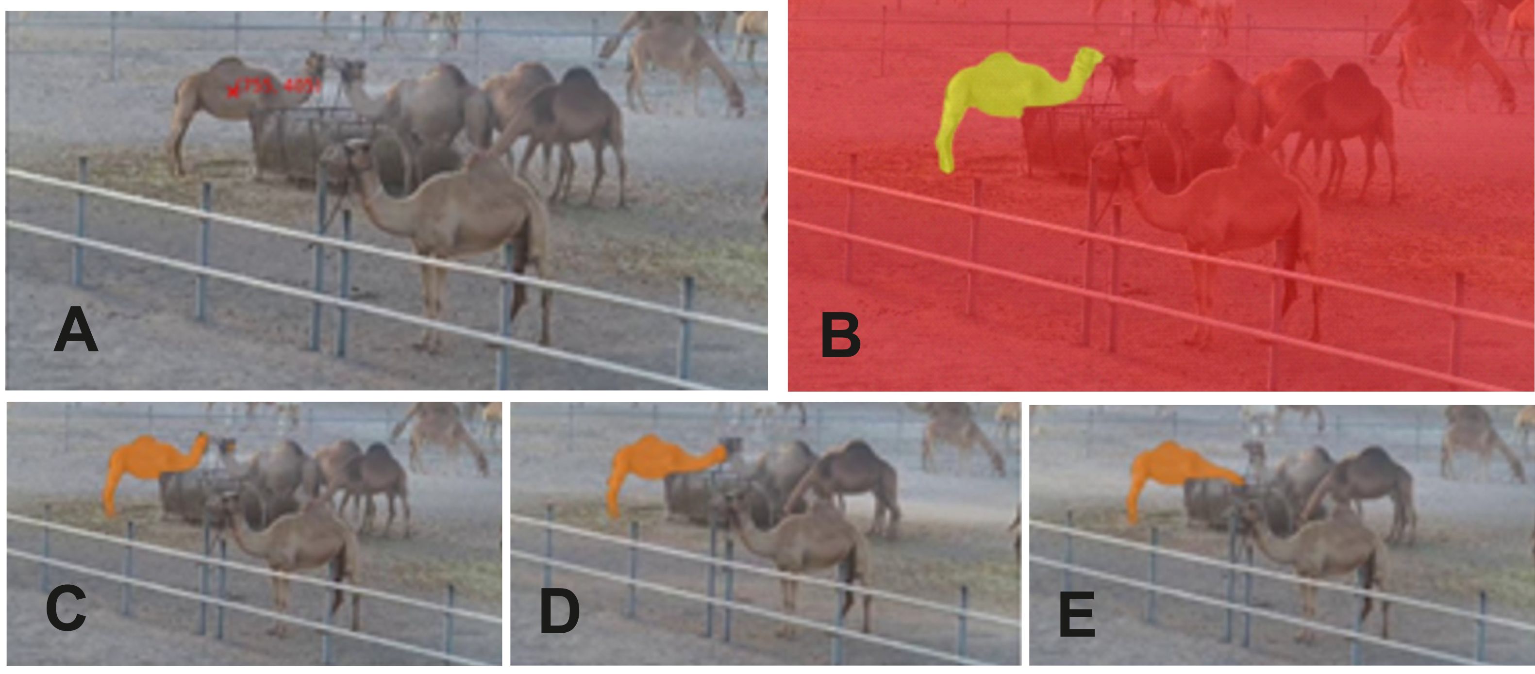 Figure 3. Camel tracking using the SAMURAI framework with a single-point prompt. (a, b) Initial point selection and the resulting segmentation mask in the first frame. (c–e) Accurate and consistent tracking of the same camel across frames 0, 90, and 150, respectively.
