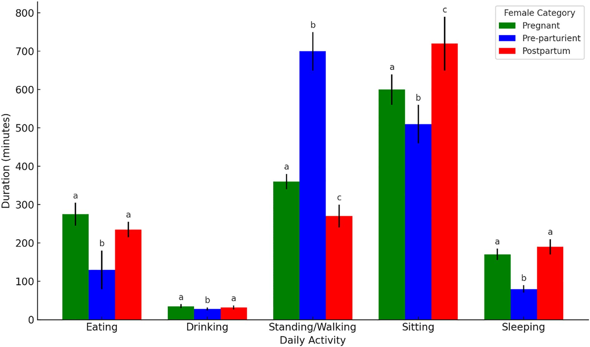 Figure 4. Comparison of 24-hour activity durations between normal pregnant, pre-parturient and post-parturient female camels. Error bars represent standard deviations. Different superscript letters (a-c) indicate statistically significant differences (p < 0.05).