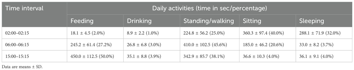 Temporal analysis at 2:00 AM, 6:00 AM, and 3:00 PM provided further validation of the camels’ circadian regulation. At 2:00 AM, the predominant activities were sitting and sleeping (70% of activity), while 6:00 AM marked a sharp transition to standing/walking feeding, and drinking activities. At 3:00 PM showed a peak in feeding (75.0 ± 4.6 min) with continued active movement. The increase in daily activity during early morning including standing/walking, eating and drinking activities agree with previous studies on immature camels (Al-Khateeb et al., 2024) and on lactating camels (Aoun et al., 2024). Additionally, the predominate sitting and sleeping activities at 2:00 AM indicated the diurnal activity of the camels. Generally, camels have documented diurnal activity rhythms when the locomotor activity started early in the photo phase and then reached its peak in the middle of the day around 12:50 h (Farsi et al., 2020). Similar activity patterns are noted also in immature and in male camels, where inactive behaviors like lying down, either in sitting and sleeping, peak during the evening and nighttime, whereas active activities such as feeding, walking, and stereotypical movements are most prevalent during daylight hours (Aubè et al., 2017; Al-Khateeb et al., 2024).