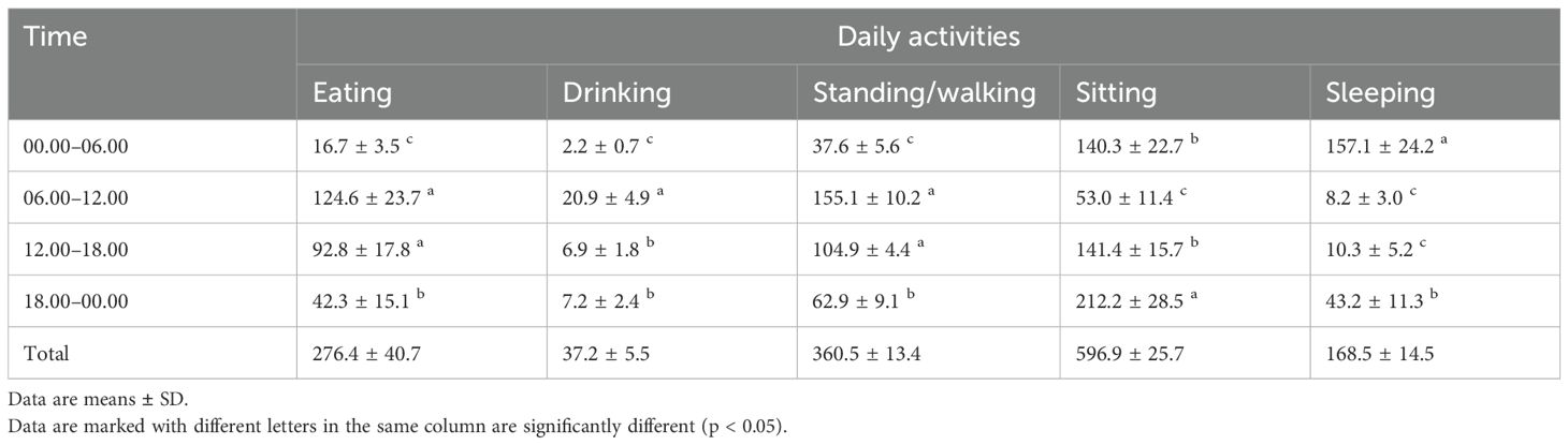 The second experiment’s employment of color-coded neck collars facilitated continuous, long-term identification and monitoring, significantly enhancing the reliability of activity data over extended periods. This method proved particularly useful in observing subtle, yet crucial temporal activity variations associated with the reproductive states of camels. Our findings are aligned with earlier research that highlighted the importance of continuous behavioral monitoring for improved swine welfare and efficient management in intensive farming conditions (Yang et al., 2024b). In pregnant camels, sitting and standing/walking were the dominant activities, averaging 596.9 ± 25.7 minutes/day and 360.5 ± 13.4 minutes/day, respectively. These findings reflect a clear diurnal rhythm in activity patterns, with increased activity during daylight hours and predominant resting at night, like the activity range observed in non-pregnant and lactating camels (Al-Khateeb et al., 2024; Aoun et al., 2024). Feeding activity was most prominent during the daylight period, particularly in the morning hours, while sleeping activity was concentrated at night, suggesting clear circadian regulation. Eating and drinking peaked between 06:00 and 12:00, coinciding with the highest levels of standing/moving activity and lower periods of sitting and sleeping. A slight decrease in eating was noted during the afternoon. From 18:00 to 06:00, the main activities shifted to sitting and sleeping. Sitting peaked during the evening until midnight, while sleeping reached its highest levels from midnight until early morning. These activity patterns are consistent with previous observations in camels, which demonstrate strong diel activity patterns influenced by ambient temperature, light exposure, and feeding cycles (Farsi et al., 2020). Dromedary camels in their natural habitat, camels spent a plenty of their time walking in search of food, water, and shade at the expense of some resting activities such as lying and sleeping (Fesseha and Desta, 2020). Moreover, similar baseline patterns in non-stressed dairy cows suggest that extended standing and feeding periods when within physiological limits are indicative of positive welfare status and homeostasis (DeVries et al., 2004; Andriamasinoro et al., 2016).