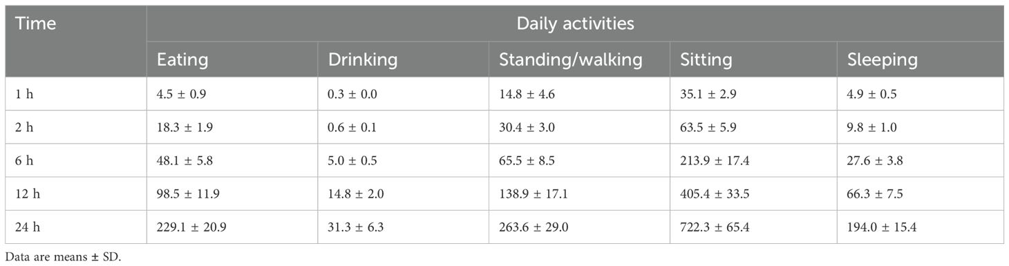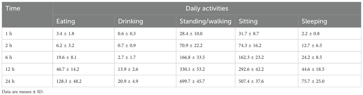 As shown in Table 4, the daily activity durations of 12 postpartum female dromedary camels were recorded over the first 24 hours following parturition. Sitting was the predominant activity, averaging 722.3 ± 75.4 minutes, followed by standing/walking (263.6 ± 29.0 minutes), eating (229.1 ± 20.9 minutes), sleeping (194.0 ± 15.4 minutes), and drinking (31.3 ± 6.3 minutes). A notable increase in activity levels was observed over time. Eating activity rose from just 4.5 ± 0.9 minutes in the first hour to 229.1 ± 20.9 minutes by the end of 24 hours. Similarly, drinking increased from 0.3 ± 0.0 to 31.3 ± 6.3 minutes, and sleeping activity rose steadily from 4.9 ± 0.5 minutes in the first hour to 194.0 ± 15.4 minutes over the full 24-hour period. This gradual increase reflects a return to normal physiological functions as the camels recovered from parturition.