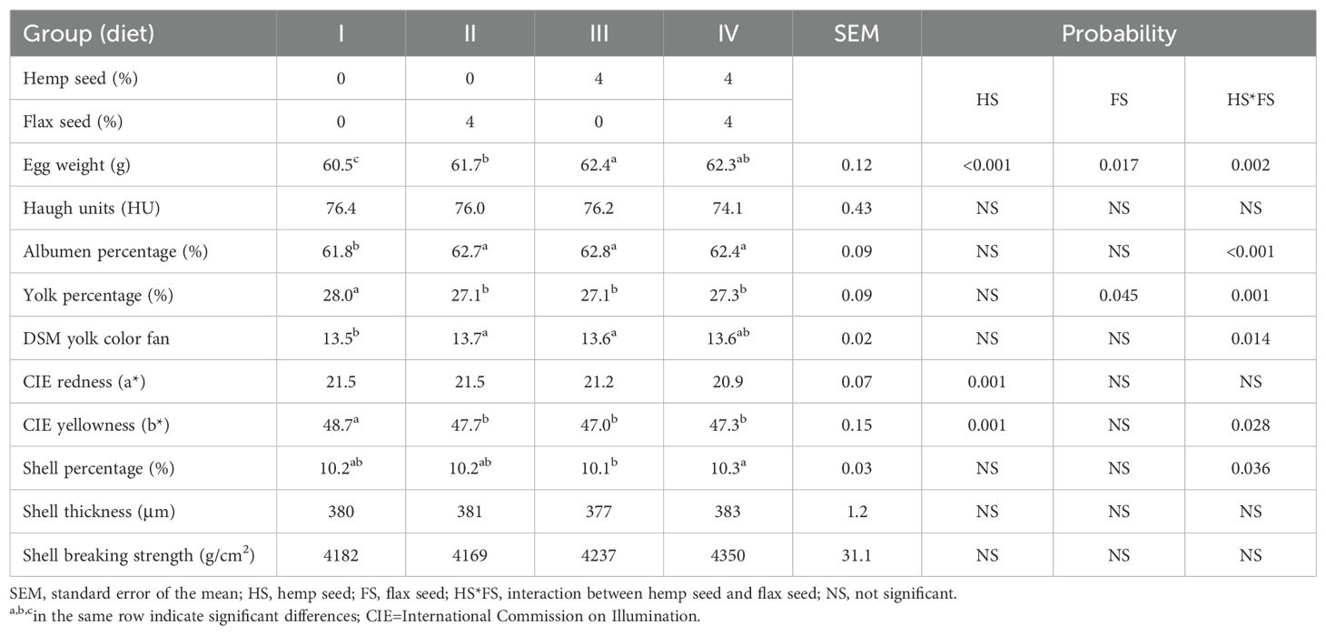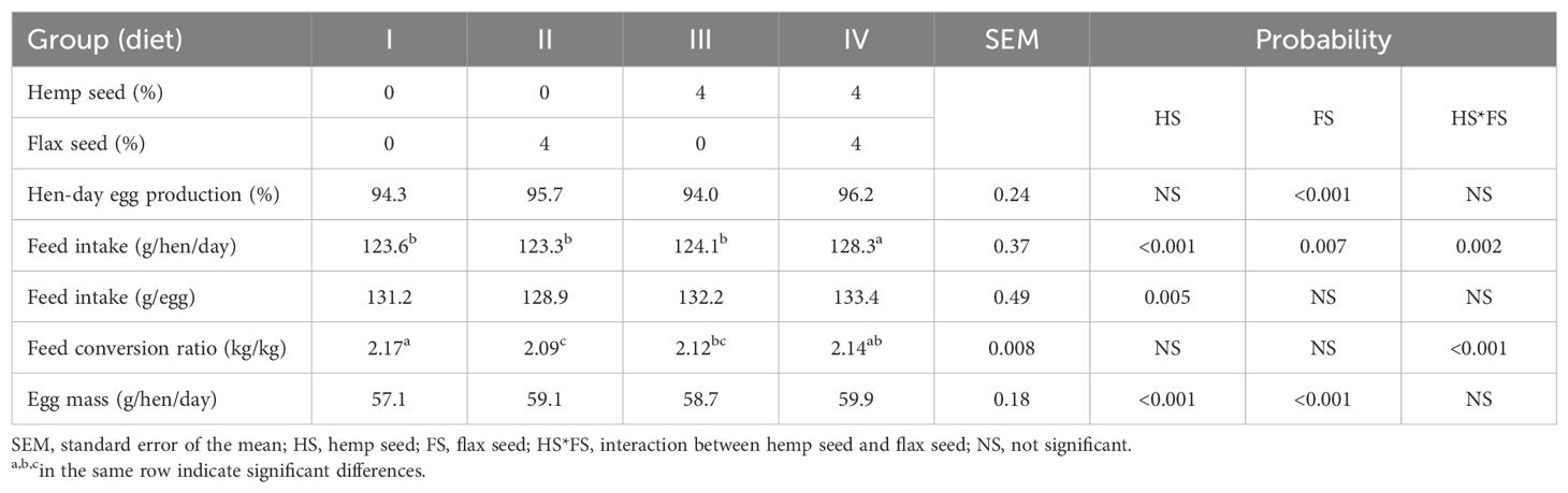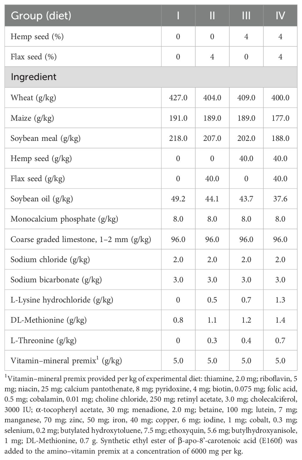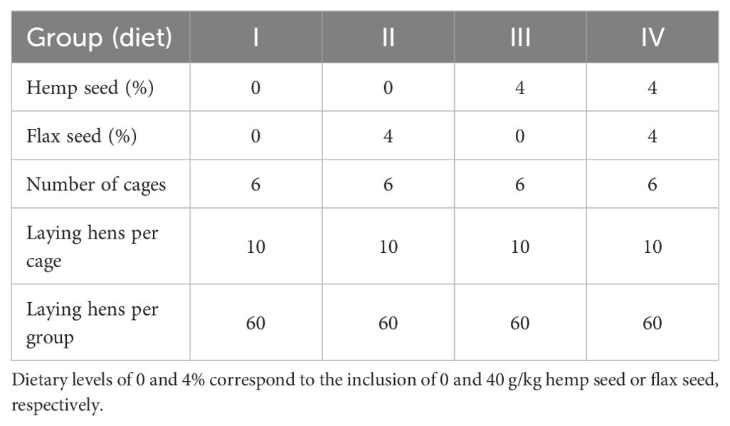 α-linolenic acid (ALA, C18:3, n-3), the main n-3 PUFA, is an essential nutrient for both animals and humans (Jing et al., 2017). ALA and its long-chain derivatives, eicosapentaenoic acid (EPA, C20:5, n-3) and docosahexaenoic acid (DHA, C22:6, n-3), are FAs required for normal development and optimal health maintenance (Farinon et al., 2020) and have been shown to reduce the risk of cardiovascular and allergic diseases (van den Elsen et al., 2012), as well as inflammatory conditions (Honda et al., 2015). Furthermore, the n-6/n-3 PUFA ratio remains a critical indicator of fat quality and is recommended to be below 4 (Simopoulos, 2008). The World Health Organization (WHO) recommended sufficient intake of n-3 PUFAs, particularly EPA and DHA, which are found primarily in fish and seafood products (Cardoso et al., 2016). However, this recommendation is not applicable in low-income countries, where fish consumption is low because of limited availability and high prices (Neori and Agami, 2024). In contrast, eggs are consumed more frequently in almost all countries around the world because of their availability and low cost (Taaifi et al., 2023). Therefore, enriching eggs with n-3 PUFA-rich ingredients represents a sustainable and practical strategy to support a healthy, well-balanced diet while simultaneously reducing pressure on marine resources (Kumar et al., 2019). Good sources of n-3 PUFAs are seeds and their oils (Jing et al., 2017), which may include hemp seed (HS) and flax seed (FS).