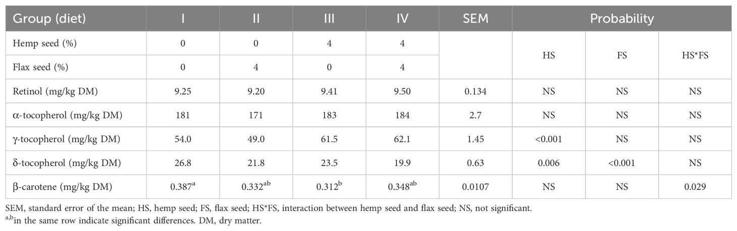 Eggs are an affordable and highly nutritious food that provides an excellent source of high-quality proteins and essential fats (Réhault-Godbert et al., 2019). They are also widely recognized as a valuable source of several fat-soluble and water-soluble vitamins (Adeoye et al., 2023). Owing to their rich nutritional profile, eggs are considered an ideal medium for delivering additional health-promoting bioactive compounds, the presence of which can be significantly modulated by the diet of laying hens. In particular, growing interest in n-3 PUFAs in relation to human health and well-being has driven research aimed at enriching the n-3 PUFA content of eggs through dietary supplementation with n-3 PUFA-rich ingredients (Usturoi et al., 2025). In the present study, HS from the non-psychoactive variety Futura, non-extruded FS from the variety Floral, and their combination were tested as supplementary feed ingredients in laying hen diets.