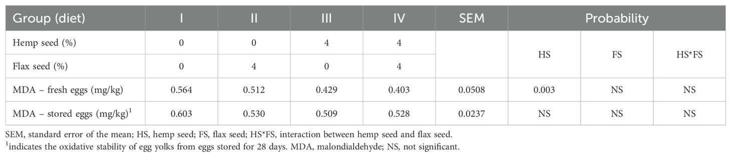 As previously mentioned, the highest egg weight observed in our experiment was recorded in laying hens fed the diet (III) supplemented exclusively with HS (Table 5). An increase in egg weight is generally associated with an age-related increase in egg yolk weight, often at the expense of other egg components (Johnston and Gous, 2007). Interior egg quality, particularly yolk weight, can also be influenced by the dietary lipid content (Ayerza and Coates, 1999). Although the inclusion of oilseeds in the experimental laying hen diets did not positively affect the egg yolk percentage, a noticeable increase in the egg albumen percentage was observed in all the seed-supplemented groups (i.e., II, III, and IV). Neijat et al. (2014) reported that a 30% inclusion rate of HS, which partially replaced soybean meal and corn oil in the diet of laying hens, substantially lowered egg weight compared with 10% and 20% inclusion levels, although total egg production and feed intake remained unaffected. Nevertheless, several other studies have provided evidence of a positive effect of HS and its by-products on egg weight (Gakhar et al., 2012; Halle and Schöne, 2013; Skřivan et al., 2019) and shell thickness (Konca et al., 2019). However, although the highest dietary concentration of HS (90 g/kg) used in the study by Skřivan et al. (2019) led to a reduction in shell thickness, no statistically significant effect was observed in our experiment, where shell thickness and breaking strength remained unaffected across all dietary treatments. Interestingly, a significantly higher shell percentage was observed in group IV, which received the combination of HS and FS, than in group III, which received HS alone. However, Panaite et al. (2021) reported no effect on shell percentage or breaking strength with 6% FM supplementation, although shell thickness increased significantly. With respect to yolk color, only a modest decrease in yellowness (b* values) was observed in all the seed-supplemented groups (i.e., II, III, and IV), with significant effects attributed to HS and the HS*FS interaction (Table 5). Yolk lipids contain carotenoids, which are key pigments responsible for yolk color intensity (Goldberg et al., 2012). The observed reduction in yellowness (b* values) may have been caused by increased utilization of carotenoids as powerful natural antioxidants to protect the UFAs present in the supplemented seeds. Specifically, lutein, zeaxanthin, and β-carotene have been shown to decrease lipid peroxidation in UFA-rich membranes and egg yolks, thereby improving oxidative stability and reducing MDA formation (Panaite et al., 2021; Dansou et al., 2023). However, in contrast to our findings, Goldberg et al. (2012); Konca et al. (2019), and Skřivan et al. (2019) reported increases in both redness (a*) and yellowness (b*) values following increased inclusion of HS and its by-products. In line with these observations, Halle and Schöne (2013) reported that FM increased yolk color more markedly than rapeseed meal or HM did.