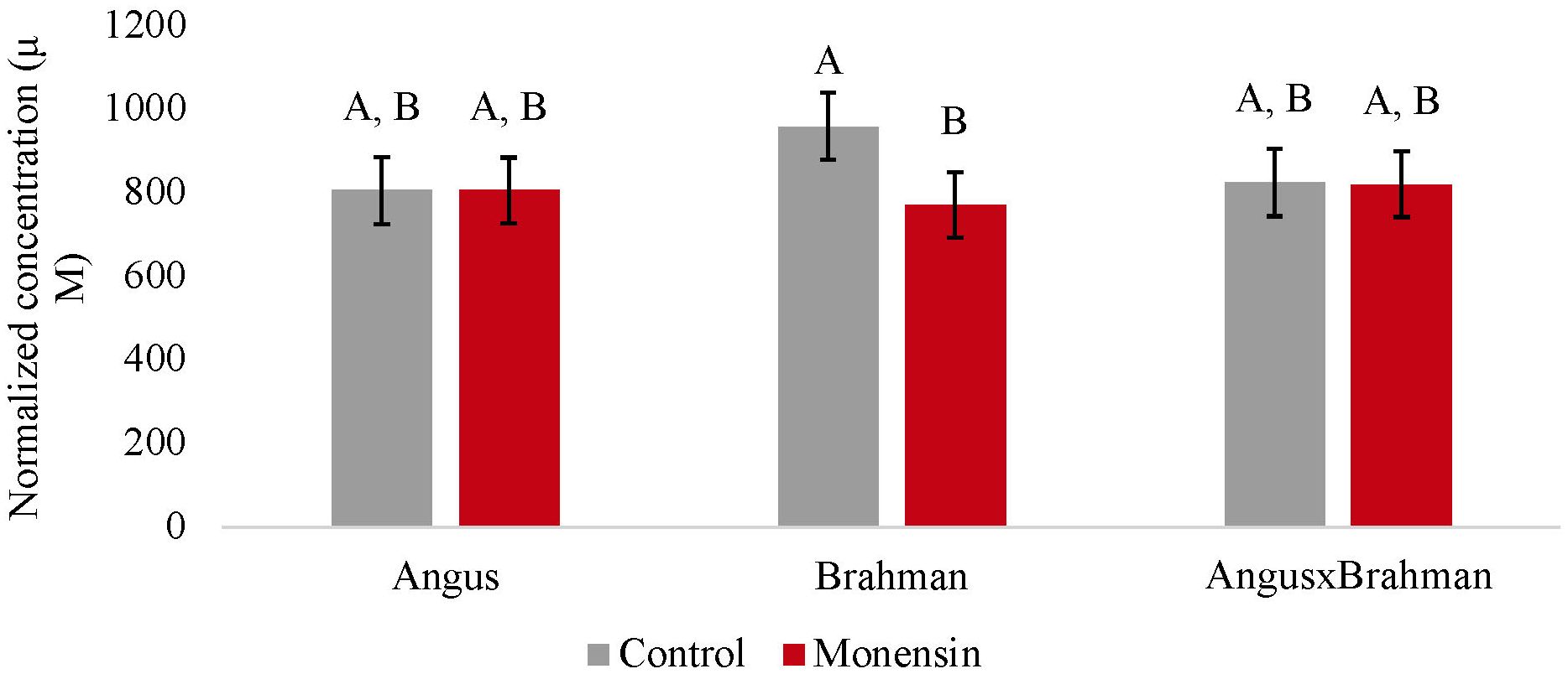 Figure 1. Ruminal acetate concentrations. Values are least-square means (LSM) ± standard error of the means (SEM). Main effects of treatments on ruminal acetate concentrations were not different (P=0.4853). A treatment-by-breed interaction was observed (P=0.039). Letters A and B indicate significance between treatment and breed interaction (P<0.05).