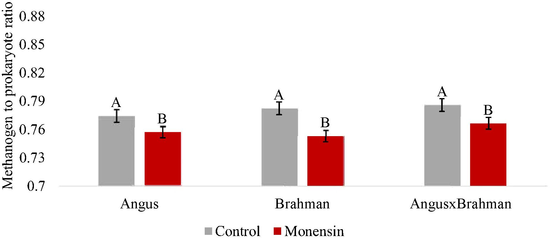 Figure 7. Ruminal methanogen to prokaryote ratio. Values are least-square means (LSM) ± standard error of the means (SEM). Main effects of treatments on ruminal methanogen to prokaryote ratio was different (P<0.001). A treatment- by-breed interaction was not observed (P=0.392. Letters A and B indicate significance between treatments, P<0.05).
