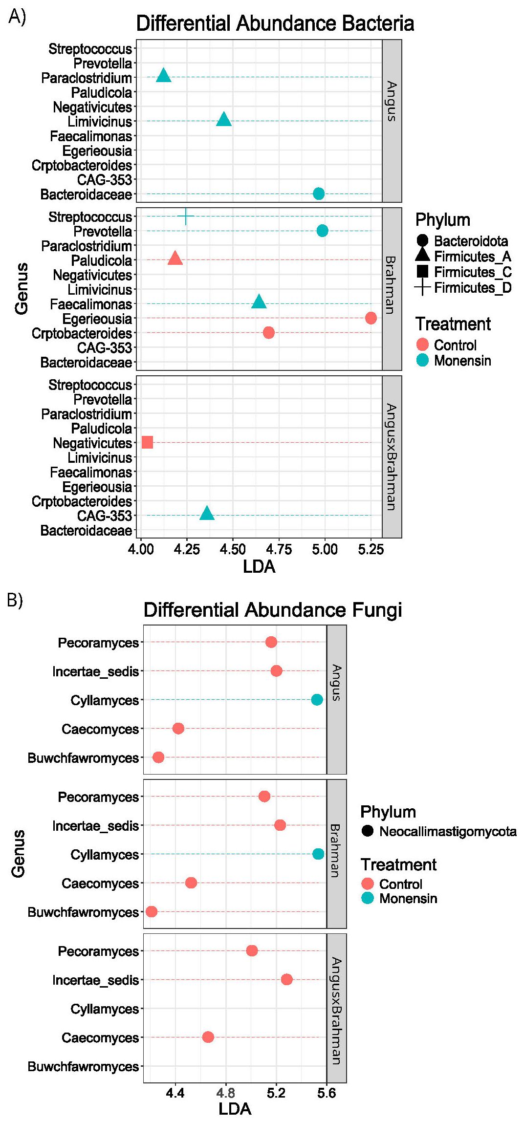 Figure 11. Linear discriminat analysis Effect size Differential abundance analysis. All values are LDA scores(log10), with (A) representing prokaryotic and (B) representing fungal communities. This graph reflects differential abundance across pairwise analysis of subspecies-by-treatment structure. Red represent control while blue represent monensin. Shape of graph A are as follow circle for Bacteroidota, triangle for Firmicutes_A, and square for Firmicutes_C and a plus for Firmicutes_D. Shapes for graph B are all circles for Neocallimastgomycota.