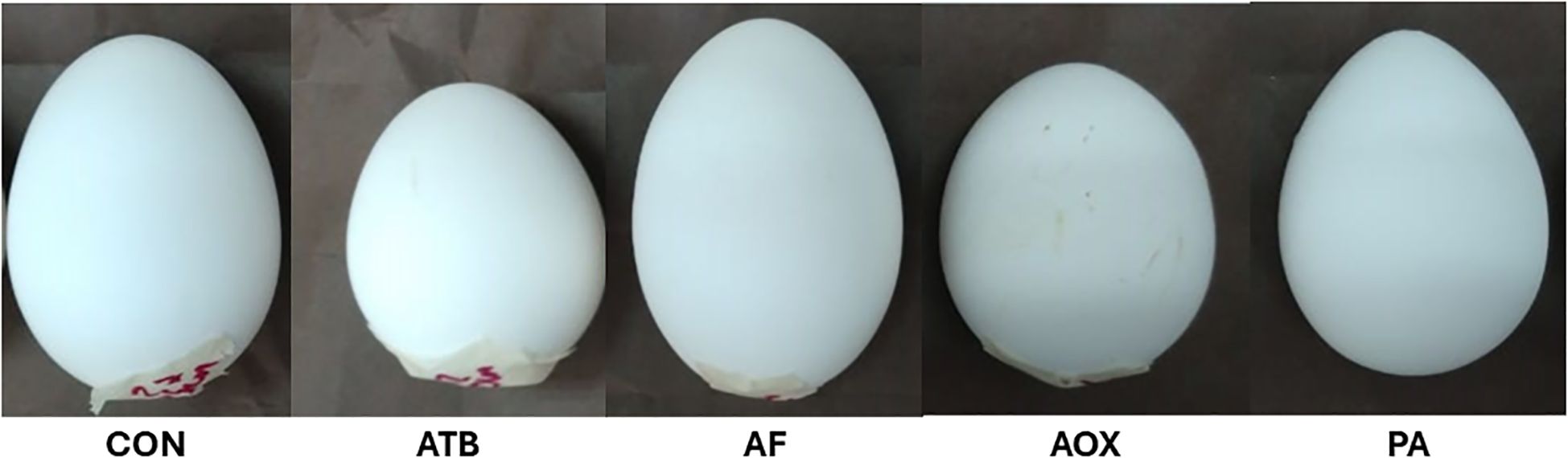 Figure 1. Representative eggs collected from hens after 12 weeks of dietary supplemented with a basal control diet (CON), antibiotics (ATB), agave fructans (PRE), turmeric powder (AOX), or the combination of both functional additives (PA).