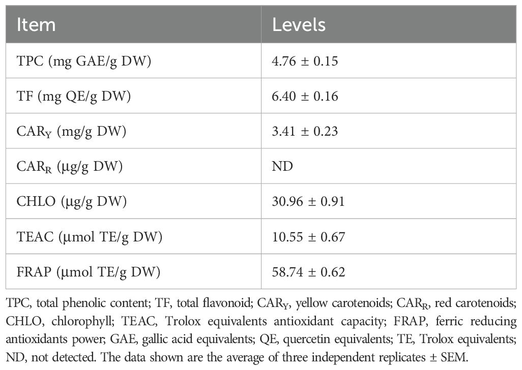 Extracts used for determining carotenoid (CAR) and chlorophyll (CHLO) content were obtained following the procedure of (Samakradhamrongthai et al., 2021). A 2 mL aliquot of the extract was used to determine the CAR and CHLO content. The absorbance was measured with a UV–Vis spectrophotometer (Genesys 10S, Thermo Scientific, Waltham, USA). CARR, and CARY (470 and 508 nm) and CHLO (646 and 663 nm), concentrations were determined according to Equations 1, 2, and 3 proposed by (Lichtenthaler, 1987; Hornero-Méndez and Mínguez-Mosquera, 2001). Results were expressed as micrograms per gram of dry weight (μg/g DW).