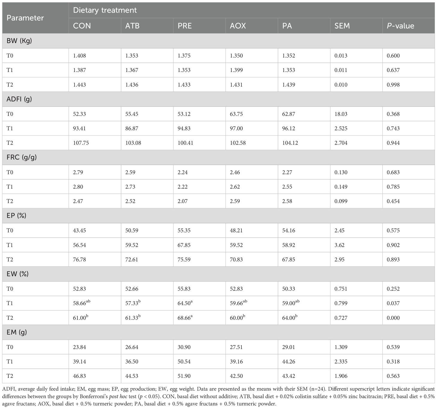 Productive performance was not affected by the treatments, which aligns with previous studies where inulin-type fructans and turmeric supplementation do not compromise feed intake or hen productivity (Shang et al., 2010; Mosayyeb Zadeh et al., 2023). However, other reports have shown improvements in weight gain and feed consumption when agave fructans are supplemented for longer periods or at different physiological stages. For instance, Sánchez-Chiprés et al. (2021) observed enhanced weight gain from weeks 5 to 18 and increased feed consumption at weeks 15 and 20 in 36-week-old hens fed 0.1% of 0.2% agave fructans (Sánchez-Chiprés et al., 2021). Moreover (Shang et al., 2020), observed a 3.09% increase in laying rate and a 3.61% decrease in feed conversion ratio with inulin supplementation during feeding weeks 1 to 8. The contrast between these results may be due to differences in the degree of polymerization or botanical source of the fructans used (Mueller et al., 2016), as our formulation used a polydisperse mixture, in addition to the fact that the age of the hens was different (Gu et al., 2021). Moreover, this variability may depend on dosage, laying phase, and duration of supplementation.