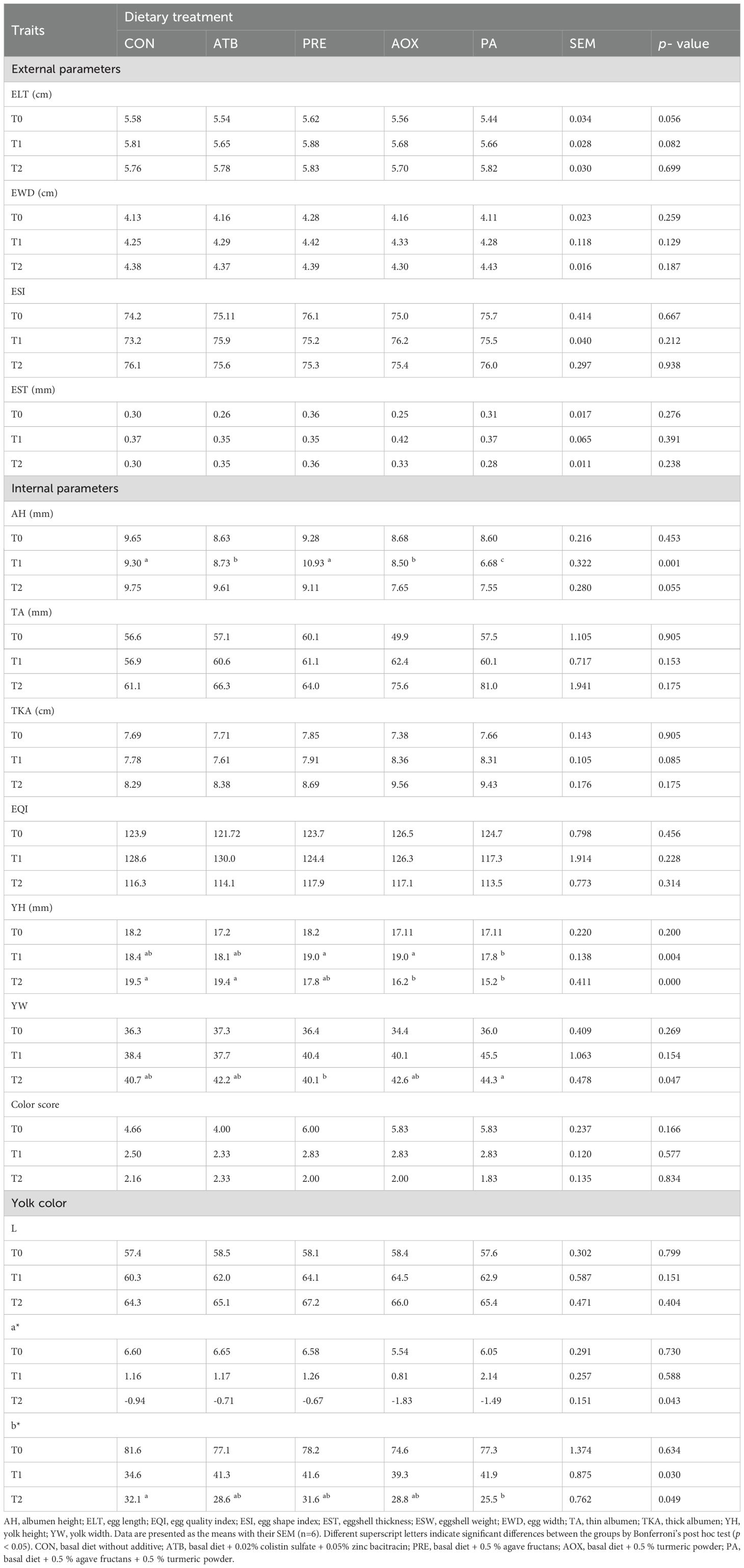 At three points during the experiment—T0 (week 21), T1 (week 27), and T2 (week 32)—a total of 90 eggs (six eggs per treatment at each time point) were randomly selected to determine egg quality traits. Egg length (EL, cm), egg width (EWD, cm), eggshell thickness (EST, mm), albumen height (AH, mm), thick albumen (TA, mm), thin albumen (tA, mm), yolk height (YH, mm), and yolk width (YW, mm) were measured using a Vernier digital caliper (HER-411, Steren, Mexico). Eggshell weight (ESW, g) was measured using an analytical balance (VE-204, Velab, Mexico). The egg quality index (EQI) was calculated using equations introduced by (Narushin et al., 2021). The color was assessed using the Yolk Color Fan (DSM, USA), while yolk color profile parameters—lightness (L*), redness (a*), and yellowness (b*) values were determined using a Hunterlab Colour Flex (Hunterlab, USA).