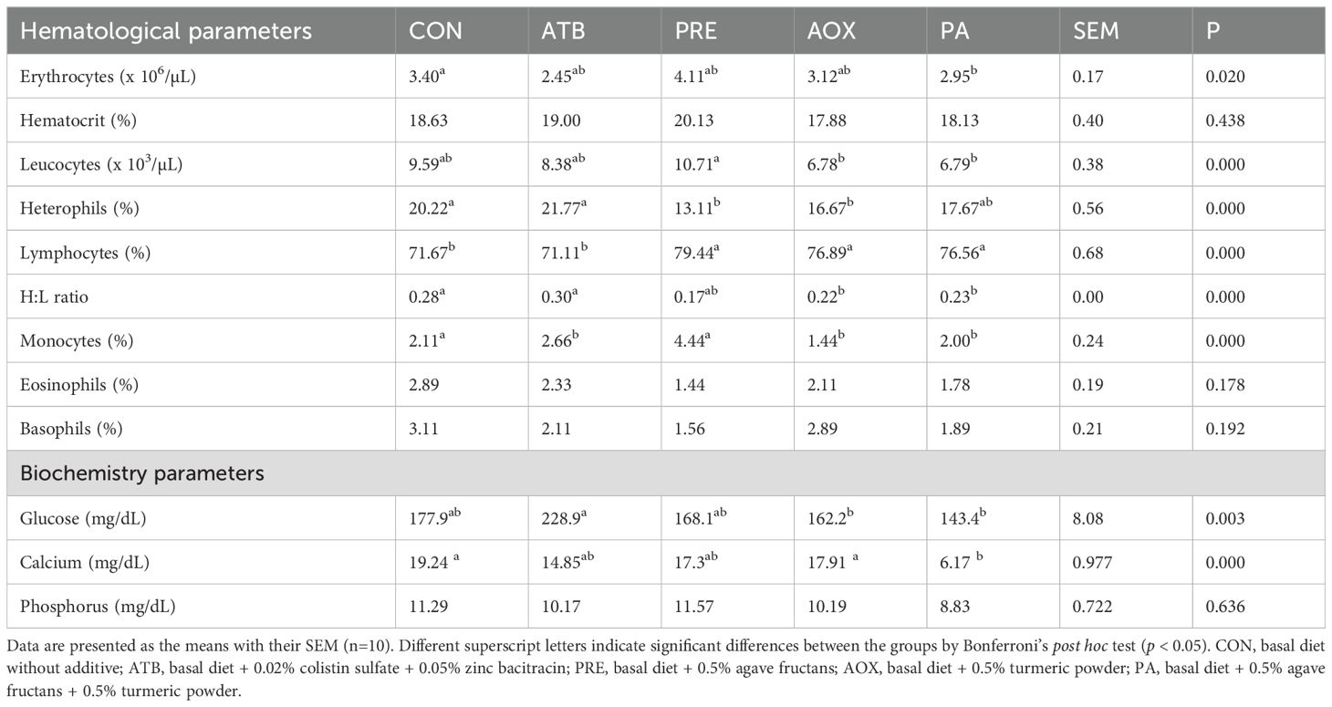 To analyze the health status of the hens during supplementation with functional ingredients, we determined the hematological parameters. Bioactive dietary components are known to exert immunomodulatory effects that enhance resistance to pathogenic challenges in poultry (Obianwuna et al., 2022; Youssef et al., 2023). Our data showed that 0.5% agave fructans exhibited and increased total leucocyte count, accompanied by a reduction in heterophils and a higher proportion of lymphocytes resulting in a lower H:L ratio, an accepted indicator of animal stress (Franco-Robles and Hernández-Granados, 2024). These results suggest that agave fructans improve immune readiness and stress resilience in early-laying hens. Importantly, unlike mannanoligosaccharides (MOS), which have shown no changes in hematological profiles at dietary levels of 0.1-0.5 g/kg (Youssef et al., 2023), agave fructans elicited a clear immunomodulatory response. The effects of turmeric powder were more modest but still measurable, as reflected by a reduced H:L ratio compared with the control group. This finding is consistent with the known anti-inflammatory and antioxidant benefits of turmeric in laying hens (Kosti et al., 2020). Together, these results indicate that both agave fructans and turmeric enhance immune status, with the former displaying a more pronounced effect under the experimental conditions.