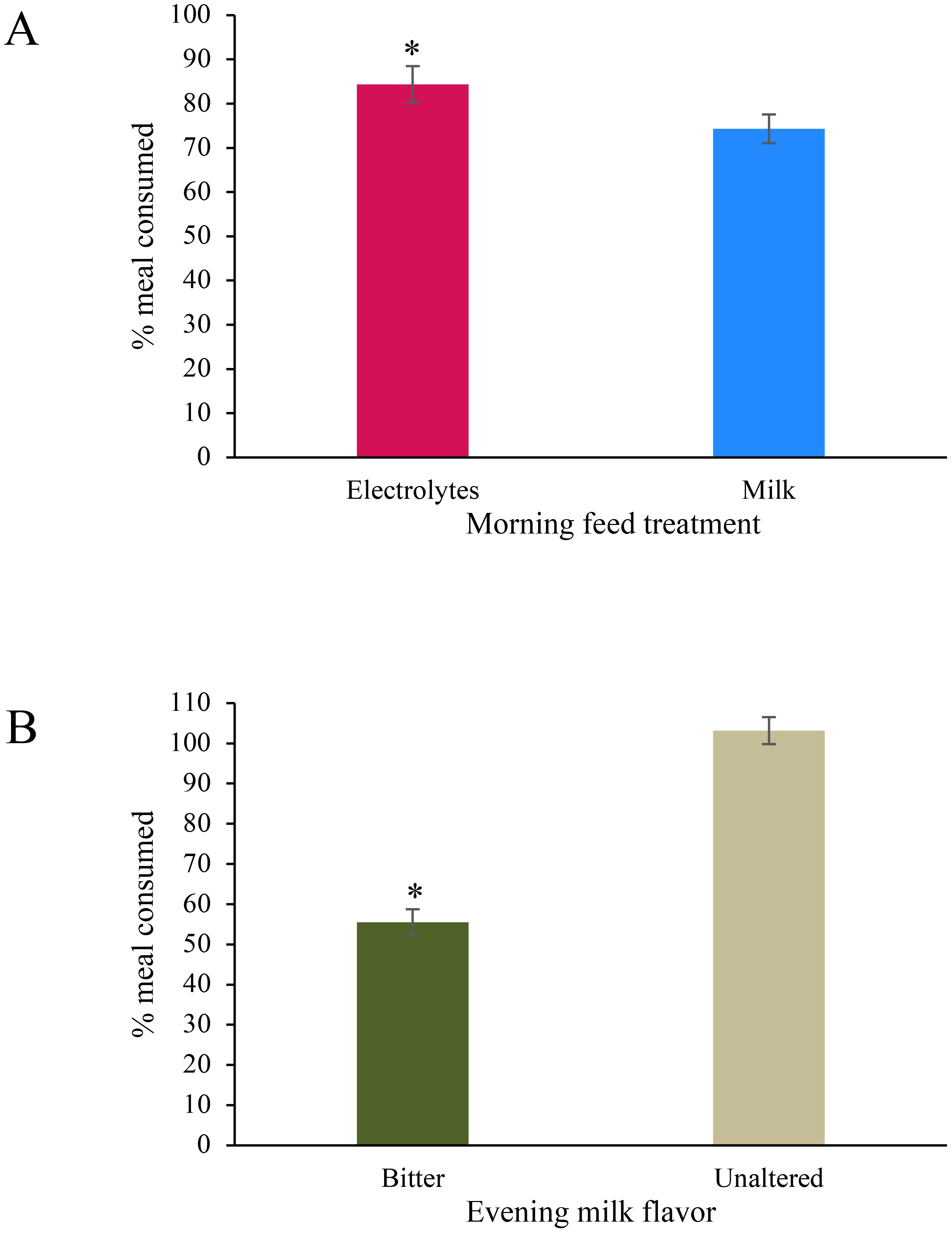 Figure 1. Bar graph showing the percentage intake (least squares mean, LSM) of the evening meal of pre-weaned dairy calves (n = 100) to characterize the effect of replacing their previous meal with an electrolyte solution. (A) During the morning meal, the calves received either electrolytes or their usual milk replacer. (B) During the evening meal, the calves received either an unaltered milk replacer or a milk replacer with a bitter additive (0.35 g/L quinine). Asterisk denotes a significant difference (p < 0.05). Error bars represent standard error (SE).