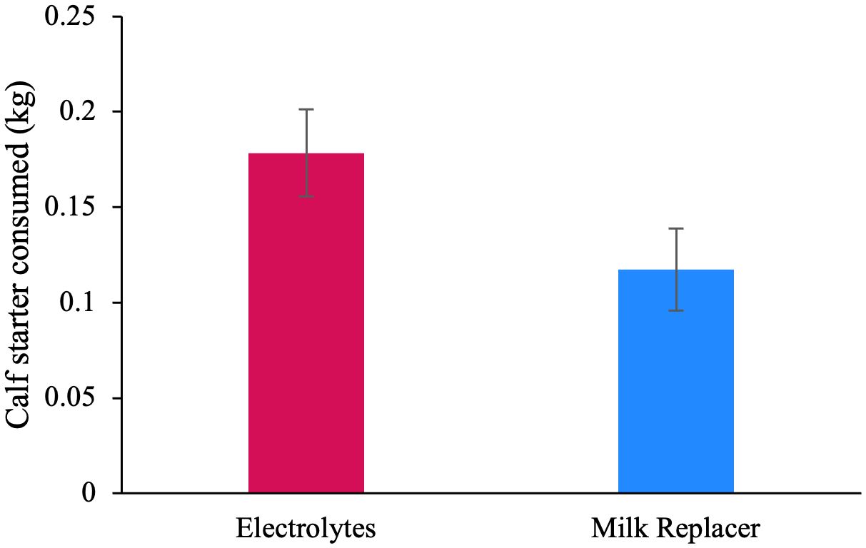 Figure 2. Bar graph showing the calf starter intake (least squares mean, LSM) of healthy pre-weaned dairy calves (n = 100) during the 8 h between the morning and evening feedings by morning feeding treatment to characterize the effect of replacing their previous meal with an electrolyte solution. During the morning meal, calves received either electrolytes or their usual milk replacer. Asterisk denotes a statistical difference (p < 0.05) between the amount of calf starter consumed by calves fed electrolytes vs. milk. Error bars represent standard error (SE).
