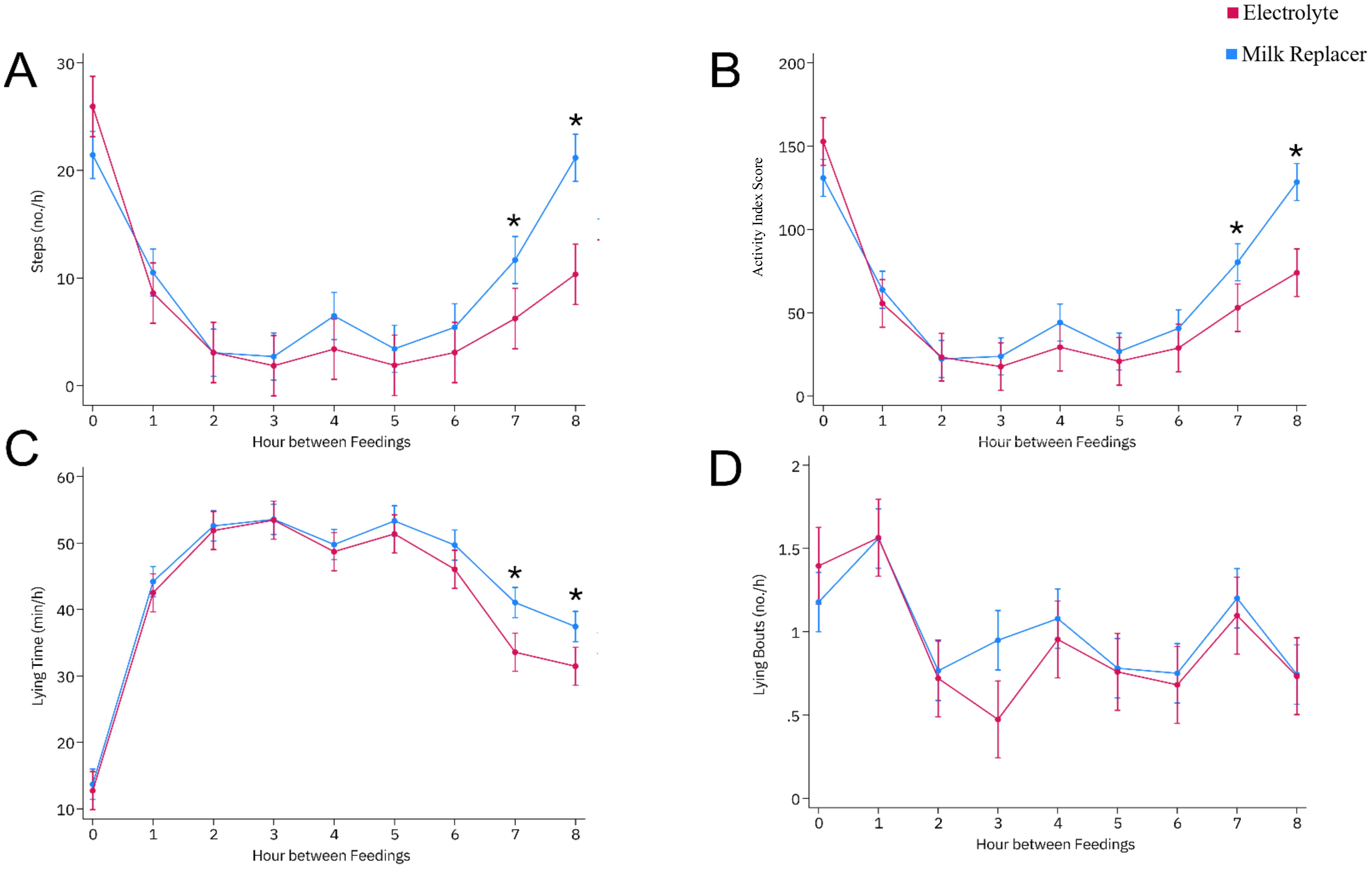 Figure 3. Margin plot of the predicted probability of the interaction between morning feeding treatment (milk or electrolytes) and the time point relative to morning feeding (0–8 h) on the steps (number per hour) (A), the activity index score (B), the lying time (in minutes per hour) (C), and the lying bouts (number per hour) (D) of healthy pre-weaned dairy calves (n = 69). Asterisk denotes a statistical difference between treatment groups (p < 0.05). Pairwise comparisons were performed at each time point, and electrolytes were compared with a milk replacer (referent). Error bars represent 95%CI.