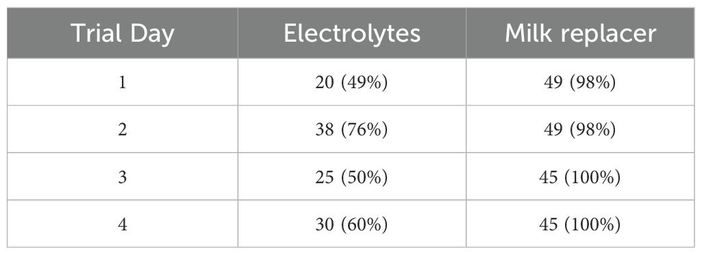 Electrolytes are recommended to combat dehydration caused by illnesses, such as diarrhea (Michell et al., 1992), and environmental factors such as heat stress (Wang et al., 2020). Furthermore, electrolytes have also been explored as a strategy to alleviate the impacts of transportation, which is physiologically challenging (Bajus et al., 2024). While electrolytes are recommended to supplement, not to replace, a milk meal, replacing milk with electrolytes is a common practice in farms. This is likely due to the idea that sick calves may refuse milk during illness (Johnson, 1998). In practice, replacing milk meals with electrolytes may last from one meal to multiple days (Michell et al., 1992; Constable et al., 2001).
