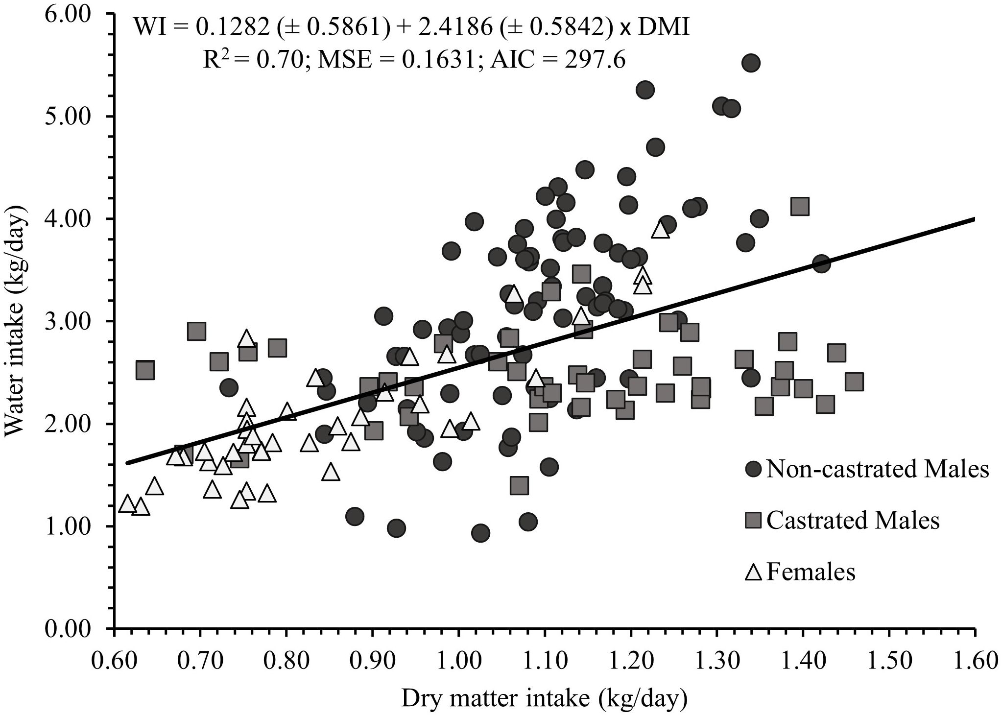 The same validation procedure and determination of model prediction errors were performed using the equation of Forbes (1968) suggested by the NRC (2007): TWI = 3.86 (± 0.75) DMI - 0.99 (± 0.41), where TWI was total water intake and DMI was dry-matter intake, both expressed as kg per head/day, respectively. In addition, graphical analysis was also used to define the best prediction model for hair sheep.