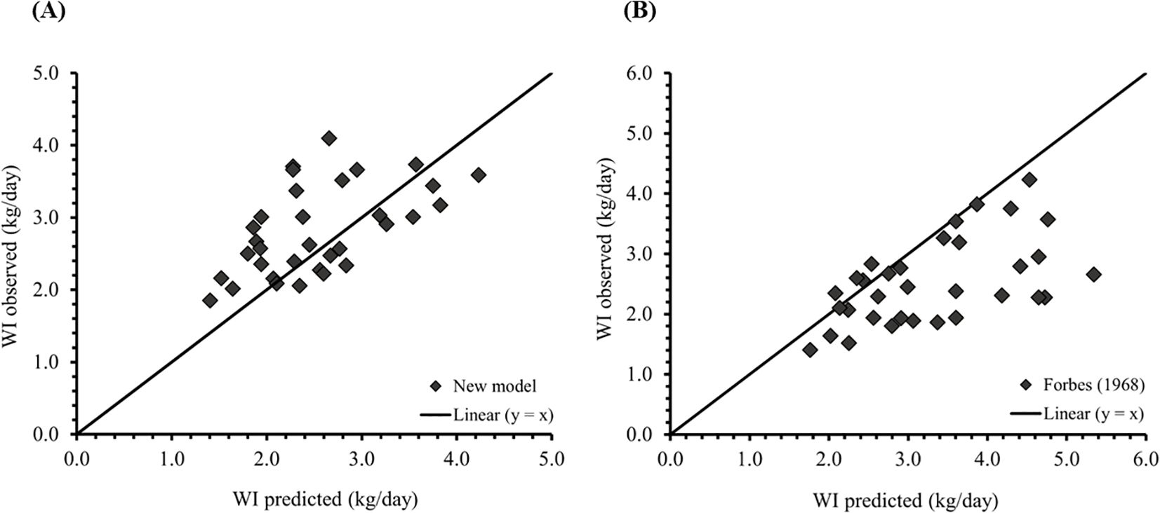 Figure 2. Relationship between observed and predicted water intake of hair sheep using the model proposed using new model of this study (A), and the model by Forbes (1968) (B).