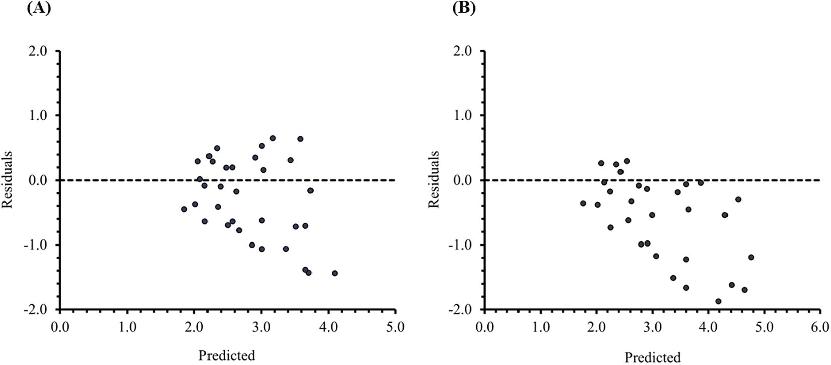 Figure 3. Distribution of prediction residuals using new model of this study (A) and using model by Forbes (1968) (B) in function of predicted water intake.