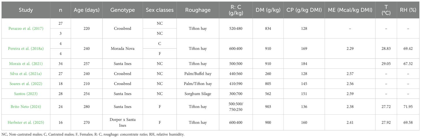 In all studies, metabolizable energy intake (Mcal/day) was estimated from TDN intake (Total nutrients digestible, kg/day), considering that 1 kilogram of TDN contains 4.409 Mcal of digestible energy and that metabolizable energy corresponds to 85% of digestible energy (Brito Neto et al., 2023). More information about estimating the digestibility of diets and TDN can be found in previously published studies (Perazzo et al., 2017; Pereira et al., 2018a; Morais et al., 2021; Silva et al., 2021a; Soares et al., 2022; Santos, 2023; Brito Neto, 2024; Herbster et al., 2025).