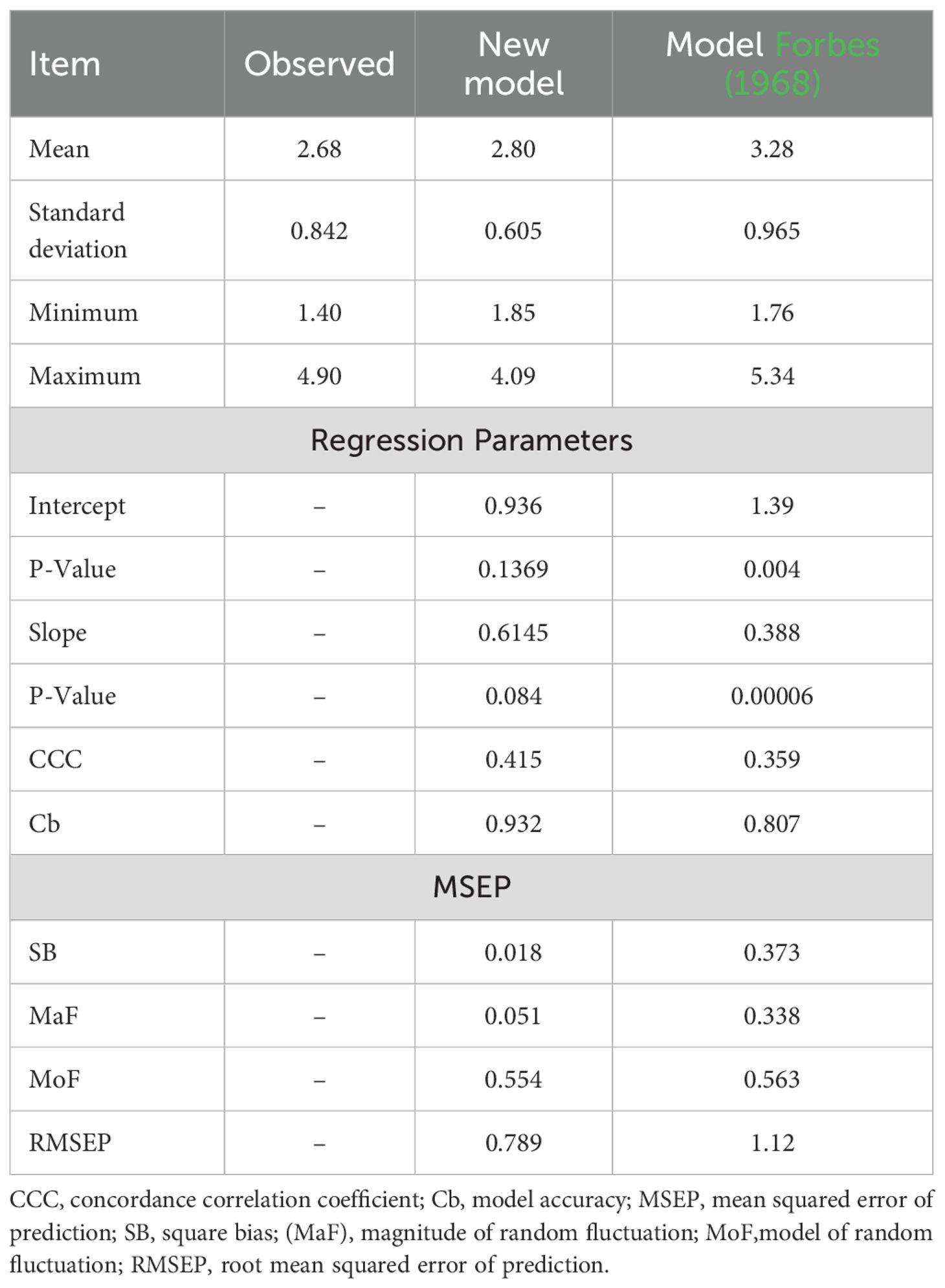 where Y = observed values; X = predicted values; β0 = intercept; and β1 = slope. Regression was evaluated with the following statistical hypotheses (Neter et al., 1996): H0: β0 = 0 and β1 = 1; Ha: not H0. The slope and intercept of the curve were evaluated separately to identify possible errors in the equations. After validation, the equations of prediction errors were determined using the estimated mean squared error of prediction (MSEP) and its components (squared bias, SB; component relative to the magnitude of random fluctuation, MaF; and component relative to the model of random fluctuation, MoF (Bibby and Toutenburg, 1977). The root squares mean prediction error (RMSEP) was used to evaluate model precision, being that the smaller the RMSEP values the better the model precision. The concordance correlation coefficient (CCC) and model accuracy (Cb) were used to assess the equation's accuracy and precision (Deyo et al., 1991; Nickerson, 1997; Liao, 2003), and values closer to +1 were better.
