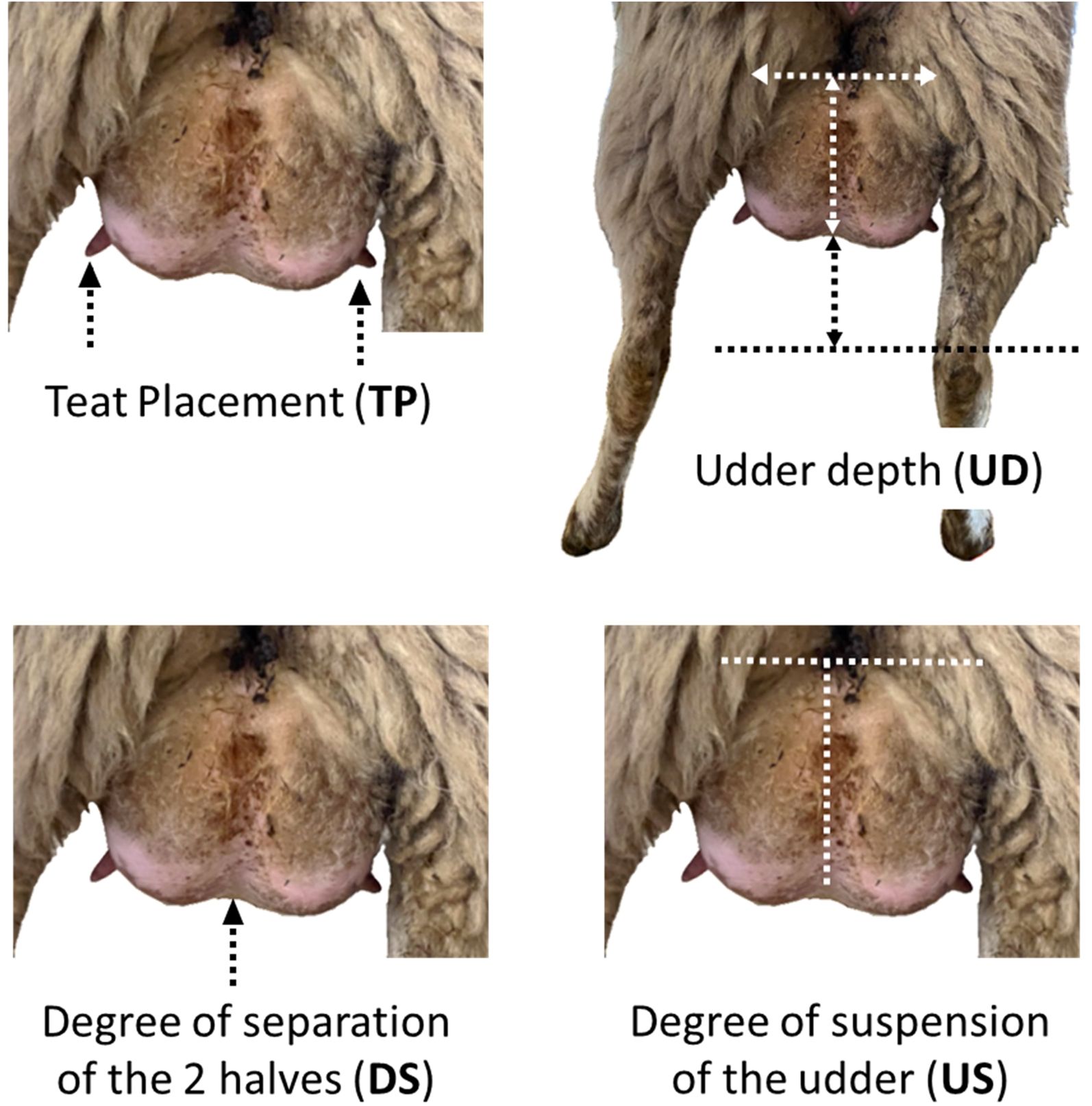 Figure 1 shows a representative photo of the udder of one ewe involved in the trial with the four udder traits evaluated.