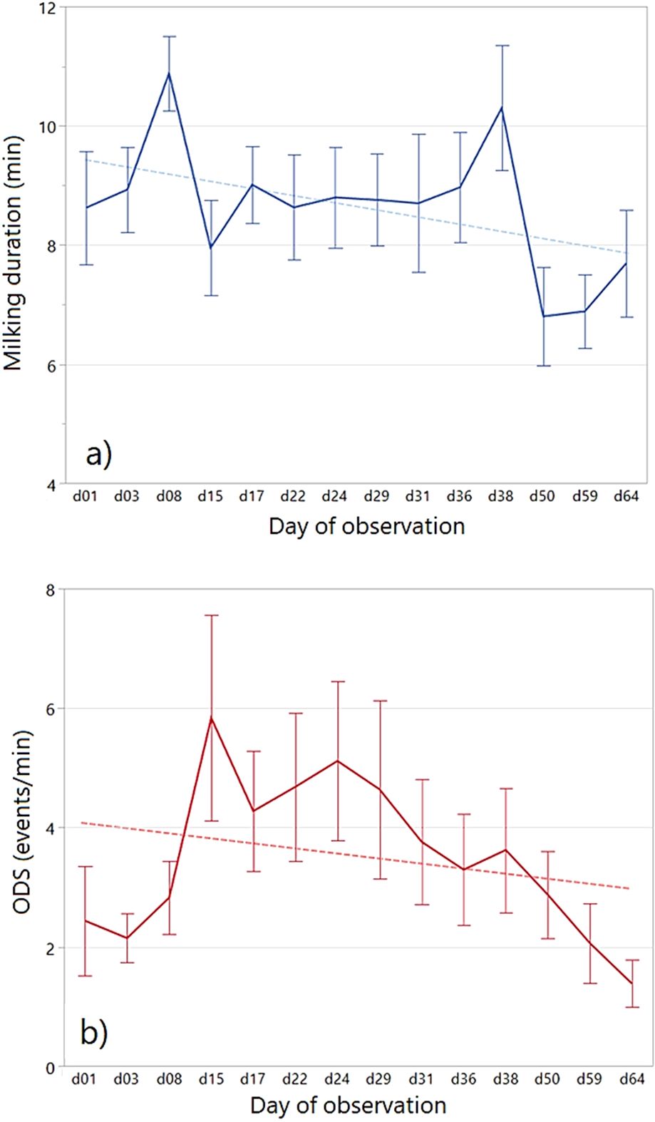 Figure 2. Temporal trend of (A) the duration of the milking phase, and (B) the overall discomfort score (ODS) (average individual values ± SE).