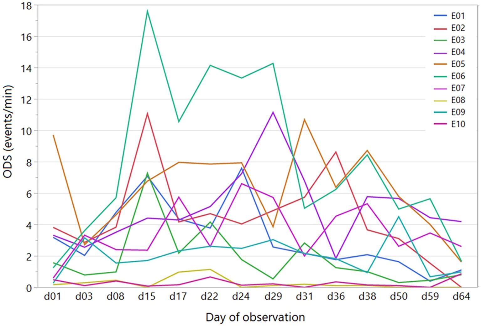 Figure 3. Individual temporal trends of the overall discomfort score (ODS) throughout the whole observation period. Lines of different colours represent different ewes.