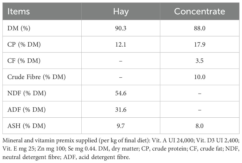 The feeding regimen of Ciuta ewes followed the farm’s standard management practices (hay and concentrate with part-time access to herbaceous pastures) and was not modified for the purposes of this study (Koidou et al., 2019; Wang et al., 2024)An estimate of dry matter intake (DMI) was made to assess whether the diet was adequate to sustain the productive performance of the ewes. On the basis of an average ewes body weight of 36 kg, and considering access to grassland for 7 h/day, the hay offered ad libitum, and 200 g/day of concentrate (see Table 1 for composition), the expected total DMI was calculated. Under full-time grazing sheep typically consume around 2.5-3.0% of body weight in DM per day (NRC, 2007). With restricted grazing time (7 h/day), intake is usually reduced to 60-70% of this potential (Molle et al., 2022), corresponding in this case to approximately 0.55-0.65 kg DM from grass. Additional contributions were provided by hay (0.30-0.50 kg DM/day) and concentrate (0.176 kg DM/day), resulting in a total DMI of about 1.0-1.3 kg DM/day per ewe. Utilizing the empirical equation proposed by Avondo and Lutri (2002), the predicted intake corresponded to 80 g DM/kg metabolic weight. For ewes averaging 36 kg live weight, this corresponds to a total DMI of approximately 1.2 kg DM/day. Nutritionally, this level of intake corresponded to 10–12 MJ of metabolizable energy (ME) and 160–220 g of crude protein. When compared with established requirements, these amounts were sufficient to meet maintenance needs (around 8 MJ ME and 60 g CP/day) and to sustain modest lactation levels of roughly 1.0 kg of milk/day (NRC, 2007). However, for higher milk yields the available energy would likely be limiting, indicating that either an increased level of concentrate supplementation or higher quality forage would be necessary.