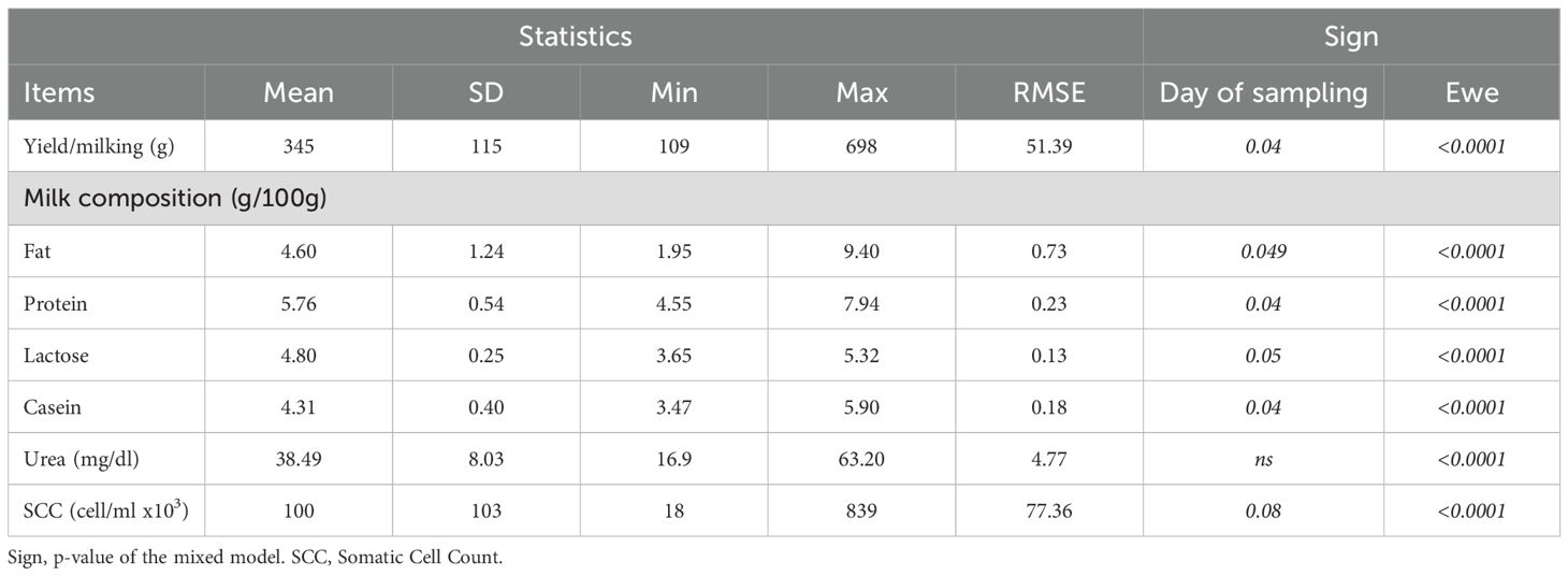 Descriptive statistics of the average yield and chemical parameters of milk are shown in Table 2. On average, a total of 3.5 kg of milk was collected per milking session from the group of 10 ewes included in the trial. The average milk yield recorded during the daily manual milking session was 345 g per ewe, with a statistically significant individual variation (p<0.0001), from a minimum of 109 g to a maximum of 698 g observed in two different ewes. The average chemical composition of milk was characterized by 4.6% fat, 5.76% protein, 4.80% lactose, 4.31% casein. Milk urea content (MUC) mean value was 38.5 mg/dl (maximum value of 63.2 mg/dl), and the average SCC was equal to 100,000 cells/mL.