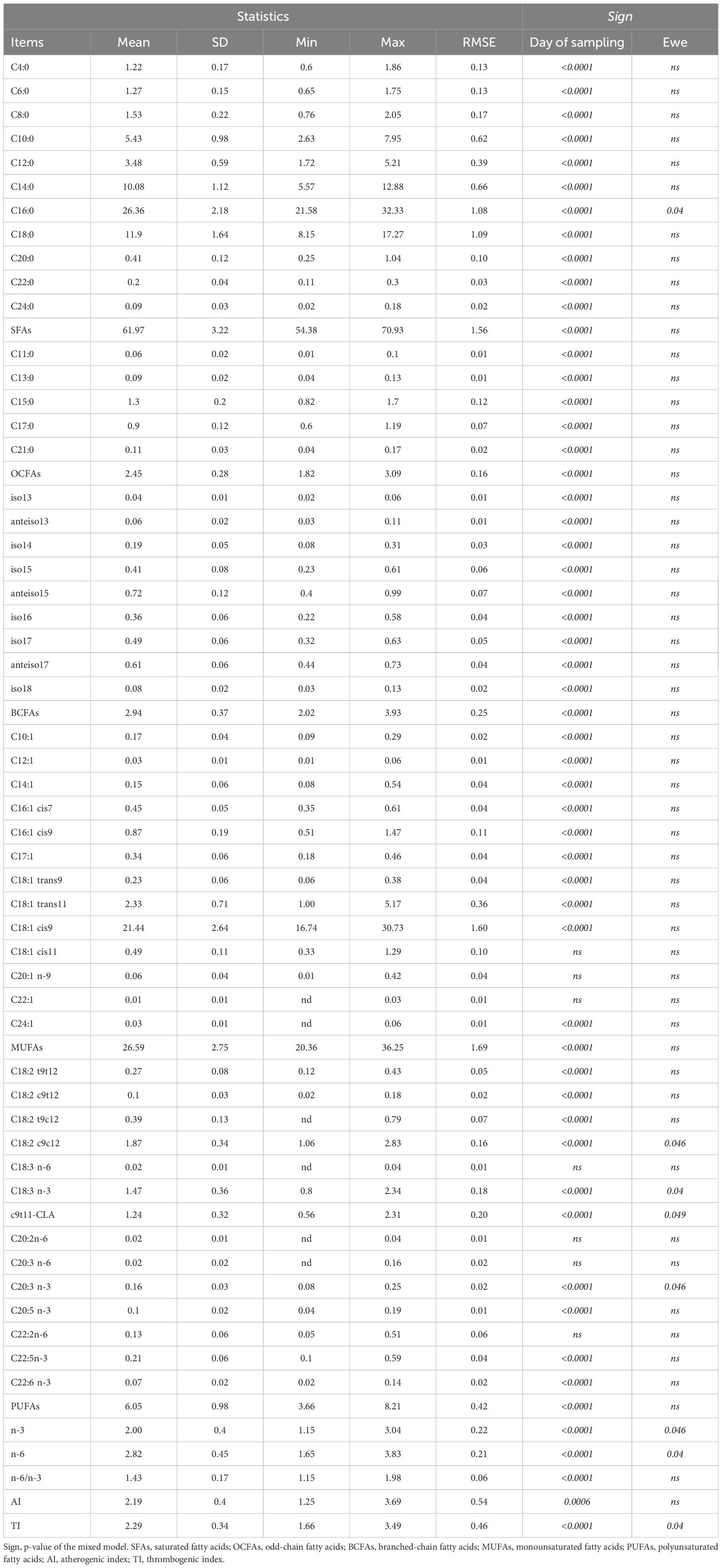 The AI and TI showed average values consistent with those reported for semi-intensive farming systems (Kasapidou et al., 2021) and indicative of a favourable fatty acid profile. Lower AI and TI values are associated with higher levels of unsaturated FAs (MUFAs and PUFAs) and reduced concentrations of SFAs considered pro-atherogenic, such as C12:0, C14:0, and C16:0 (Ulbricht and Southgate, 1991). Similar results were observed by De Renobales et al. (2012), who reported lower AI in milk from grazing ewes compared to TMR-fed animals. In this context, it is worth noting that Ciuta milk contains a variety of bioactive compounds with potential health benefits, including medium- and short-chain FAs, BCFAs, OCFAs, and naturally occurring trans-FAs. In a recent review, these dairy components have been associated with cardiometabolic health and with favourable health outcomes (Mozaffarian and Wu, 2018).
