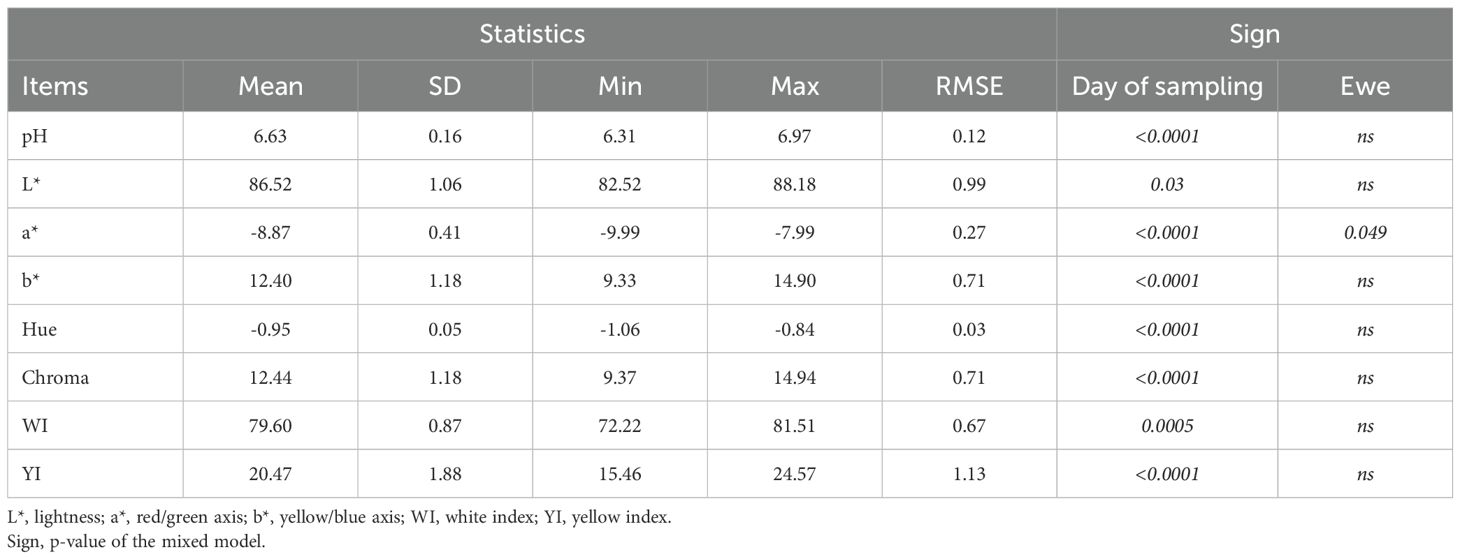 Descriptive statistics of average pH and colour parameters of milk are shown in Table 4. Milk showed pH values ranging from 6.31 to 6.97, with an overall mean of 6.63 and exhibited a generally white appearance, as indicated by the high average lightness value (L* = 86.52). Its colour profile was characterized by a moderate yellow saturation (b* = 12.40) and negative a* values which indicate green hues (a* = –8.87). The chromatic coordinates (Chroma = 12.44; Hue angle = –0.95) further confirmed the visual impression of a white milk with a perceptible greenish-yellow tint. The average white index (WI) and yellow index (YI) were equal to 79.60 and 20.47, respectively.