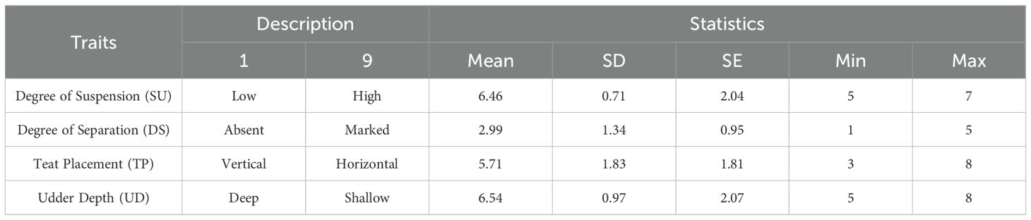 The udder appraisal was carried out using the method of Casu et al. (2006). This method considers four udder traits, each scored with a 9-point linear scale: teat placement (TP), udder depth (UD), degree of separation of the halves (DS) and degree of suspension of the udder (SU).
