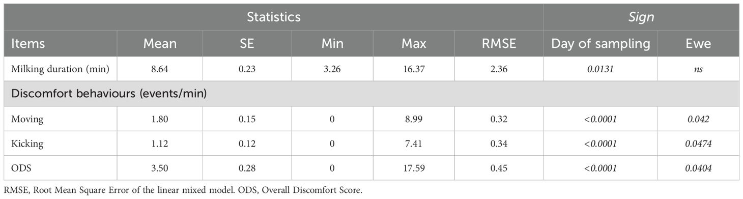 Table 6. Descriptive statistics and results from the mixed model on the milking duration (min) and the main discomfort behaviours (events/minute) observed in Ciuta sheep (N = 140).