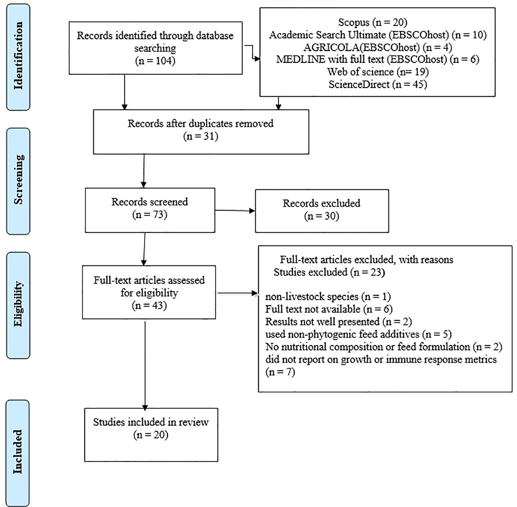 The results of the systematic search process are illustrated in Figure 1. The initial search yielded a total of 104 records from the following databases: Scopus (n=20), Web of Science (n=19), EBSCOhost (including Academic Search Ultimate (n=10), AGRICOLA (n=4), MEDLINE with full text (n=6)), and ScienceDirect (n=45). Following the retrieval, a total of 31 duplicate records were removed; 30 of these were identified by Covidence, and one was manually removed. The remaining 73 records were subjected to title and abstract screening, which resulted in the exclusion of 30 studies. Full-text screening was subsequently performed on the remaining 43 articles. During this stage, 23 articles were excluded according to the established eligibility criteria. Consequently, 20 studies were selected for inclusion in the final review.