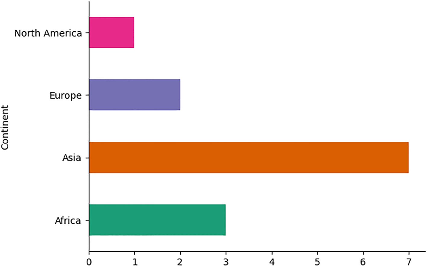 Finally, Yanga et al (Yang et al., 2023). reported that dietary supplementation with a phytogenic feed additive (PFA) tended to improve the growth performance of crossbred Angus steers during a 110-day growing period. Steers receiving PFA had a final body weight of 415 kg compared to 403 kg in controls and achieved an overall average daily gain (ADG) of 1.31 kg/d versus 1.20 kg/d in the controls, although these differences were not statistically significant compared to monensin (final BW = 422 kg; ADG = 1.38 kg/d). The gain-to-feed ratio (G: F) was greater for monensin (0.173) than for PFA (0.161) or the control (0.156), indicating a slightly greater feed efficiency with monensin. During the finishing phase (120 days), no significant differences were observed in ADG, G: F, or final BW among the PFA, monensin, and control treatments, although dry matter intake (DMI) was greater in the PFA group (10.2 kg/d) than in the monensin group (9.8 kg/d) but slightly lower than that in the control group (10.8 kg/d). In general, PFA moderately improved growth performance during the growth phase, suggesting that PFA has potential as a natural growth-promoting feed additive, although its effects on feed efficiency were less pronounced than those of monensin. Interestingly, the majority of the research on phytogenic feed for livestock production in this study was conducted in Asia, followed by Africa, with the lowest number of studies conducted in North America, as shown in Figure 2.