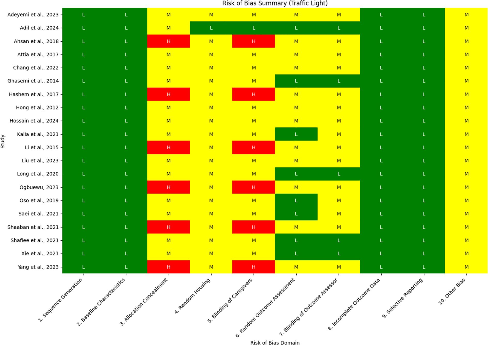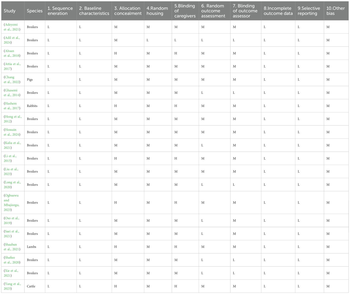 The risk of bias in the six studies included in this review was systematically assessed via the SYRCLE risk of bias tool, as shown in Table 6 and Figure 3, which is specifically tailored for animal studies (Hooijmans et al., 2014). Overall, the studies demonstrated a low risk of bias for sequence generation and baseline characteristics, reflecting adequate randomization and comparability between experimental groups. Moderate to high risk was observed for allocation concealment and the blinding of caregivers and outcome assessors, particularly in studies involving nonbroiler species, indicating the potential for performance and detection bias. Random housing and outcome assessment were generally rated as moderate risk, whereas incomplete outcome data and selective reporting were considered low risk. In summary, the evidence is moderately reliable, with broiler studies yielding the most robust data, whereas findings from rabbits, lambs, and cattle should be interpreted cautiously owing to limitations in study design and blinding procedures.