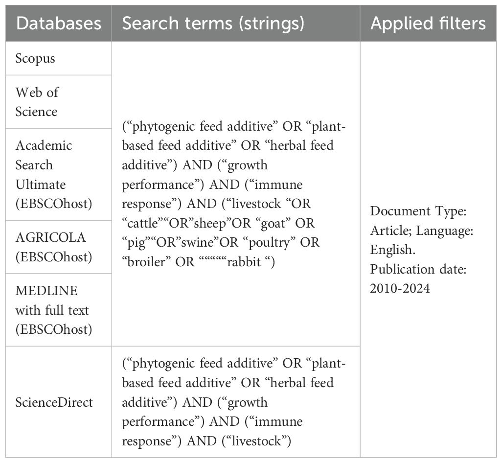 While this systematic review offers important insights into the effects of phytogenic feed additives on growth and immune responses in livestock from 2010-2024, several limitations should be acknowledged. First, the selection of databases may have restricted the comprehensiveness of the review. Only seven major databases were searched—Scopus, ScienceDirect, Web of Science, and EBSCOhost (Academic Search Ultimate, AGRICOLA, and MEDLINE with Full Text)—which, although extensive, may have excluded other relevant sources containing additional studies in this field. Second, only studies published in English were considered, introducing potential language bias and possibly omitting relevant evidence published in other languages. Third, studies published before 2010 were not included, which may have overlooked earlier but still informative research on phytogenic feed additives. To mitigate these limitations, future reviews should consider expanding database coverage, including non-English publications, and incorporating earlier studies to provide a more comprehensive synthesis of the evidence.