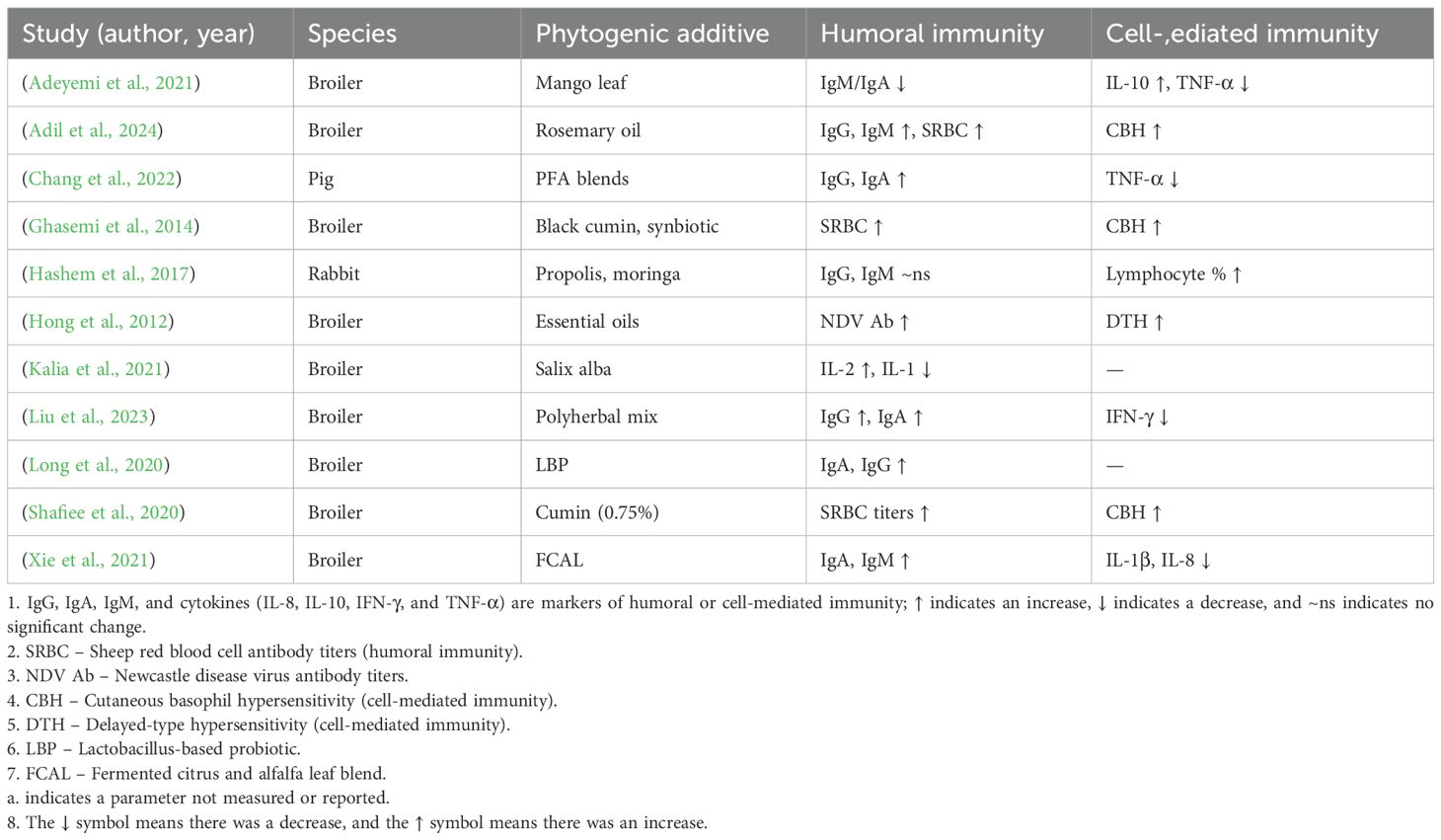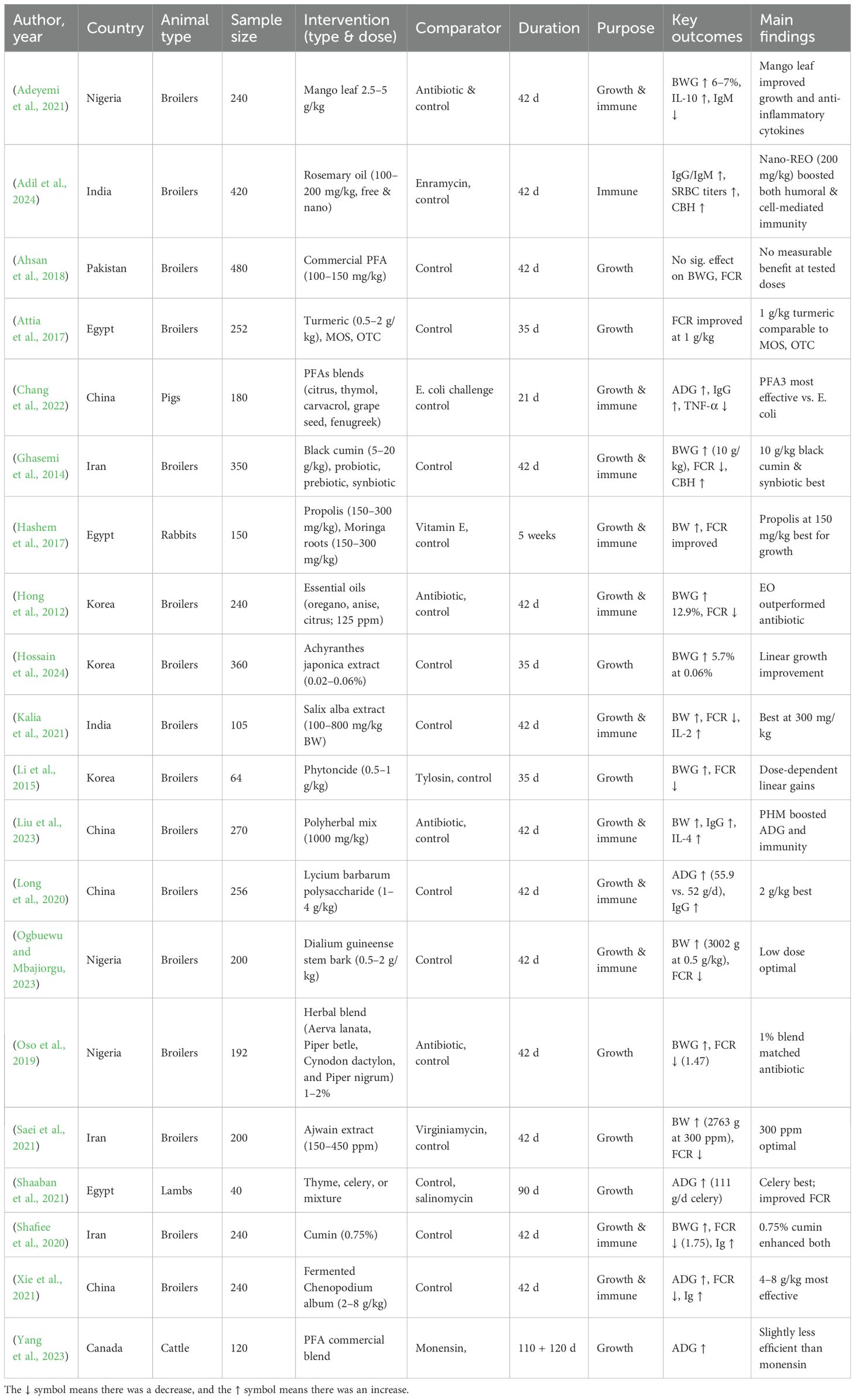 The purpose of this systematic review was to assess the impact of phytogenic feed additives on the growth performance and immune response of livestock. Table 2 shows that the majority of the studies included in this review have focused primarily on broiler chickens (Hong et al., 2012; Ghasemi et al., 2014; Li et al., 2015; Attia et al., 2017; Ahsan et al., 2018; Oso et al., 2019; Long et al., 2020; Shafiee et al., 2020; Adeyemi et al., 2021; Kalia et al., 2021; Saei et al., 2021; Xie et al., 2021; Liu et al., 2023; Ogbuewu and Mbajiorgu, 2023; Adil et al., 2024; Hossain et al., 2024), whereas only one has focused on pigs (Chang et al., 2022), rabbits (Hashem et al., 2017), lambs (Shaaban et al., 2021), and cattle (Yang et al., 2023).