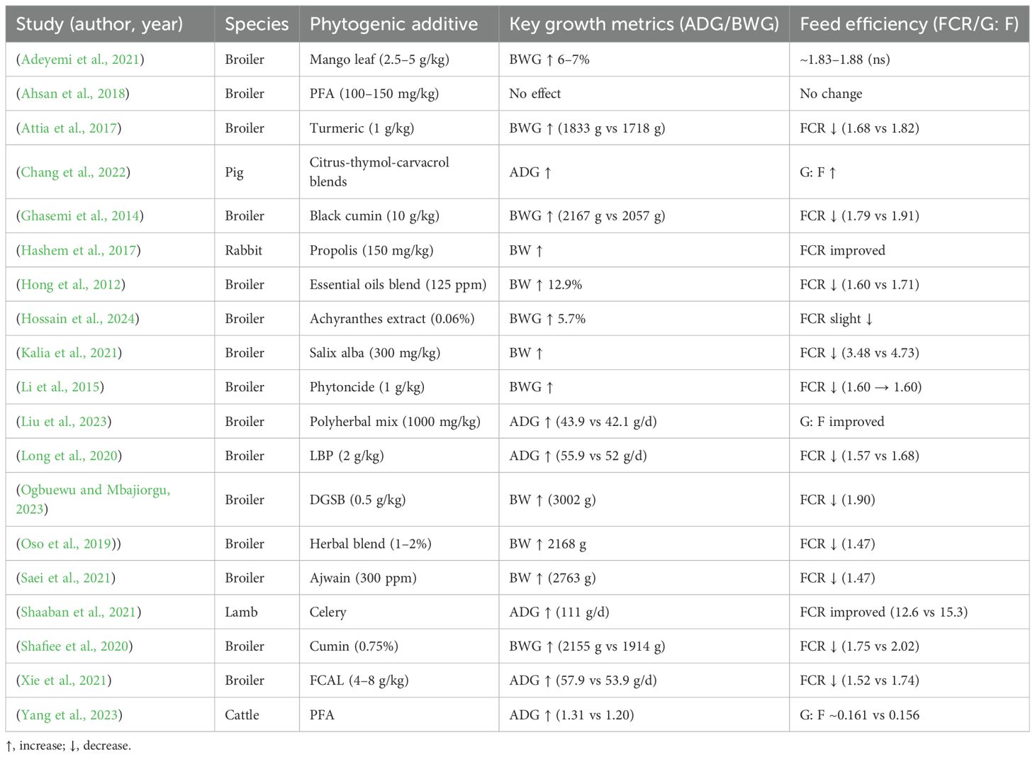 This systematic review demonstrated that phytogenic feed additives are being increasingly investigated as viable alternatives to antibiotic feed additives, which were historically used to increase growth and prevent disease in intensive livestock production (Wythe et al., 2023). This review highlights that the research landscape on phytogenic additives is heavily skewed toward broiler chickens, with 16 studies included in the review. In contrast, only one study was found for lambs, pigs, rabbits, and cattle. This bias reflects the global dominance of poultry production, which accounts for the fastest-growing and most affordable source of animal protein, particularly in low- and middle-income countries. Broilers also have a short life cycle (35–42 days), uniform genetics, and standardized management systems, making them highly suitable for controlled feeding trials where small differences in growth and immunity can be rapidly detected (Attia et al., 2017; Adeyemi et al., 2021; Liu et al., 2023, 16 –Xie et al., 2021).