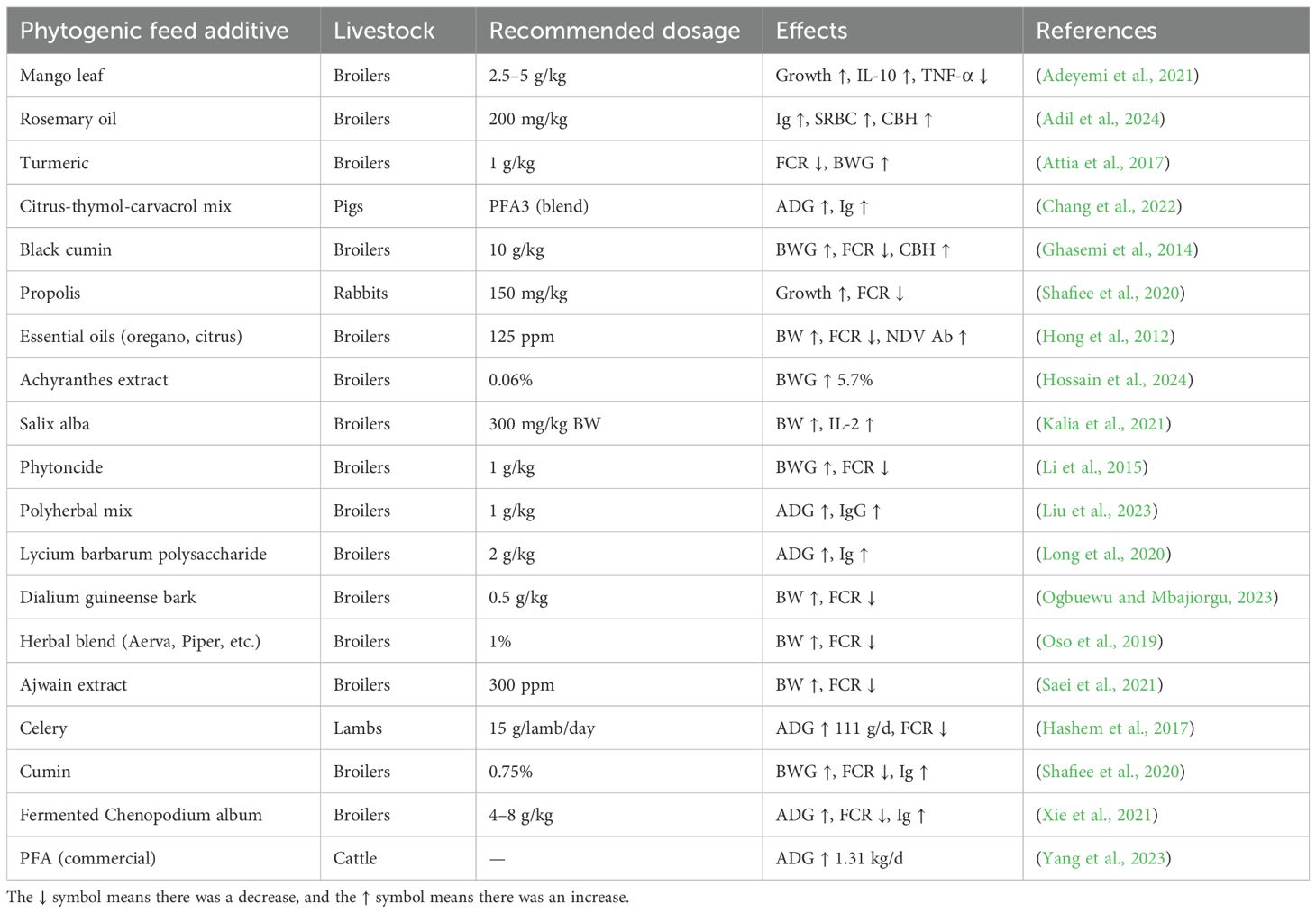Phytogenic feed additives are promising alternatives to antibiotics, enhancing growth and immune function across livestock, particularly in broilers. They reduce proinflammatory cytokines, increase antibody and lymphocyte activity, and support overall health. Optimal dosing is crucial, as excessive inclusion can impair feed efficiency, and evidence in ruminants remains limited. Blended formulations of complementary phytochemicals often provide synergistic benefits, outperforming single additives. Collectively, PFAs offer a sustainable strategy for antibiotic-free livestock production, improving productivity while maintaining immune resilience and animal welfare.