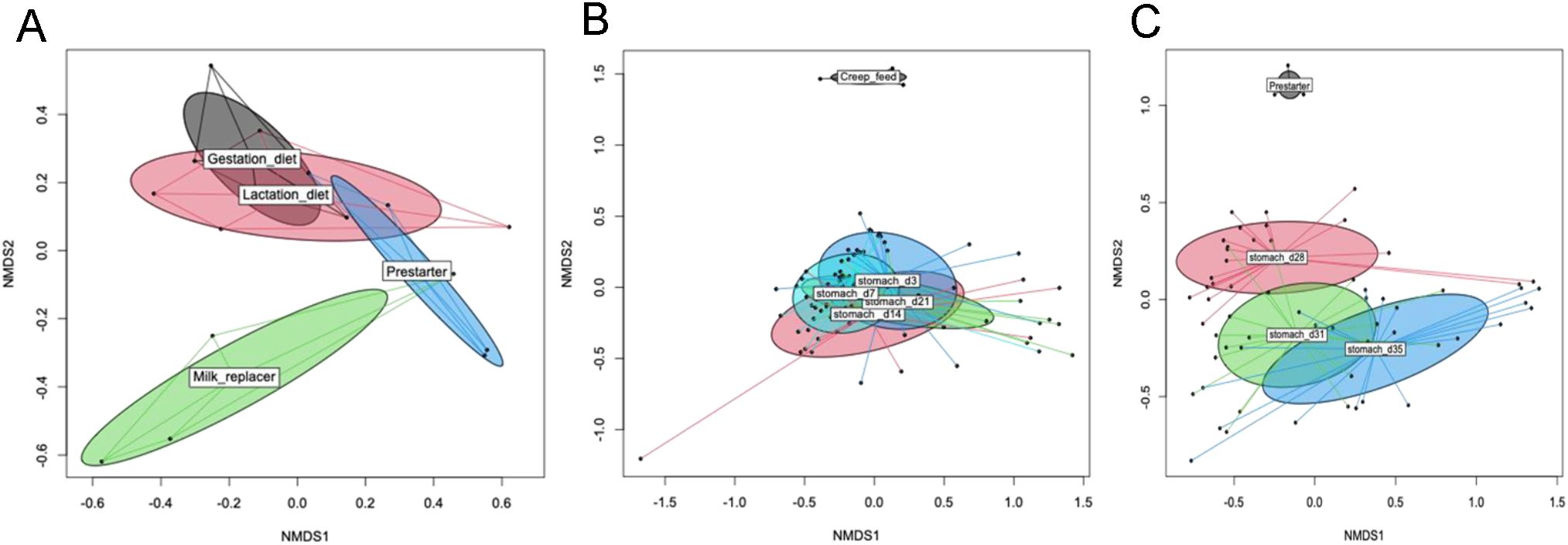Figure 1. Beta-diversity of bacterial communities in feeds for sows and piglets (A); milk replacer and gastric digesta on days 3, 7, 14, and 21 of life (B); and prestarter diet and gastric digesta on days 28, 31, and 35 of life (C). Non-metric multidimensional scaling (NMDS) based on Bray–Curtis distance.