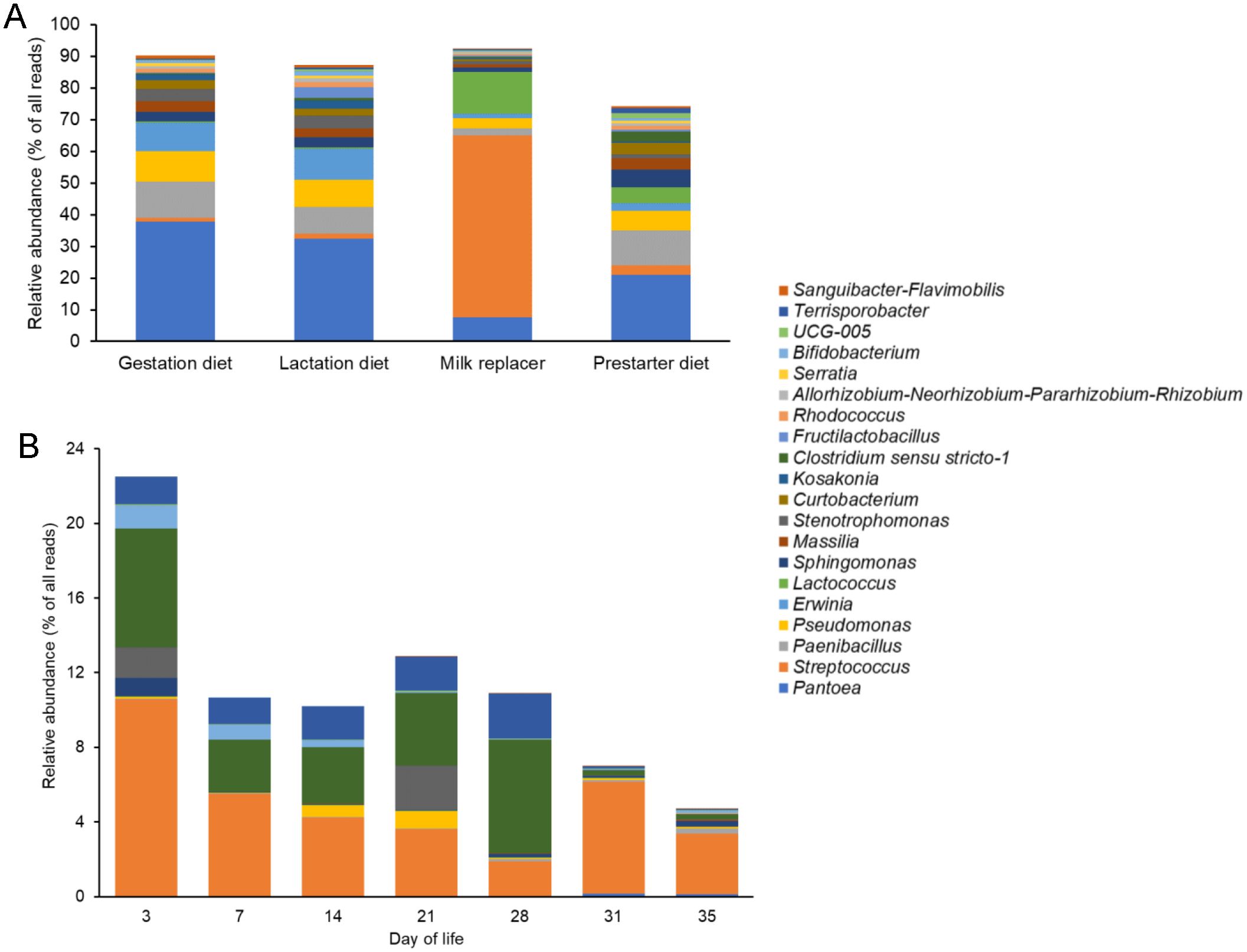 Figure 2. Relative abundances (% of all reads) of the 20 most abundant genera in feeds for sows and piglets (A) and their abundances in gastric digesta of piglets on days 3, 7, 14, 21, 28, 31, and 35 of life (B). Values are least squares means ± standard error of the mean. The genus at the bottom of the legend corresponds to the genus at the bottom of the stacked bar chart. P values for diet-type effects on genera abundances in feeds are in Supplementary Table S1. P values for age effects on genera abundances in gastric digesta are in Supplementary Table S2. Data for bacterial genera were adapted from Yosi et al. (2024).