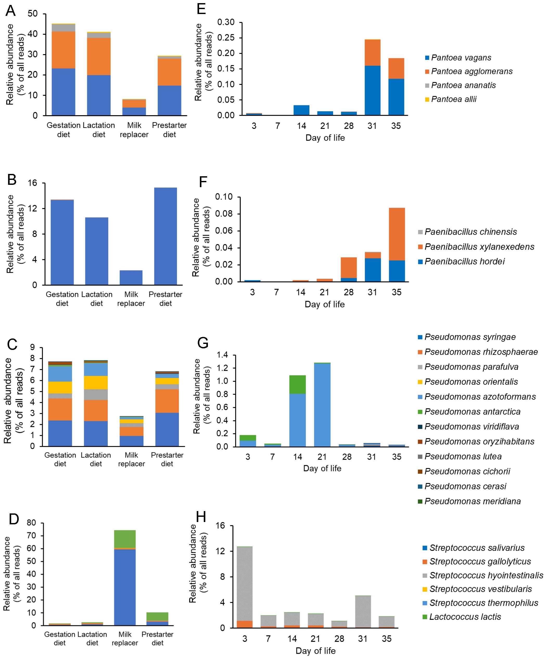 Bar charts display the relative abundance of various bacteria across different diets and days. Charts A to D depict abundance during gestation, lactation, milk replacer, and prestarter diets, focusing on Pantoea, Paenibacillus, Pseudomonas, and Streptococcus species. Charts E to H show abundance on days three to thirty-five, detailing changes in the same bacterial species. Each chart illustrates bacterial diversity and abundance variations over time and diet.